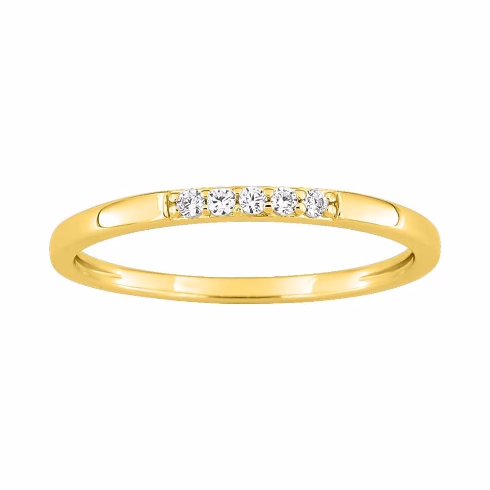 Optez pour la simplicité avec cette petite alliance en or jaune 18 carats (750/1000) qui comporte 5 diamants centraux sertis griffes pour un total de 0.07 carats.