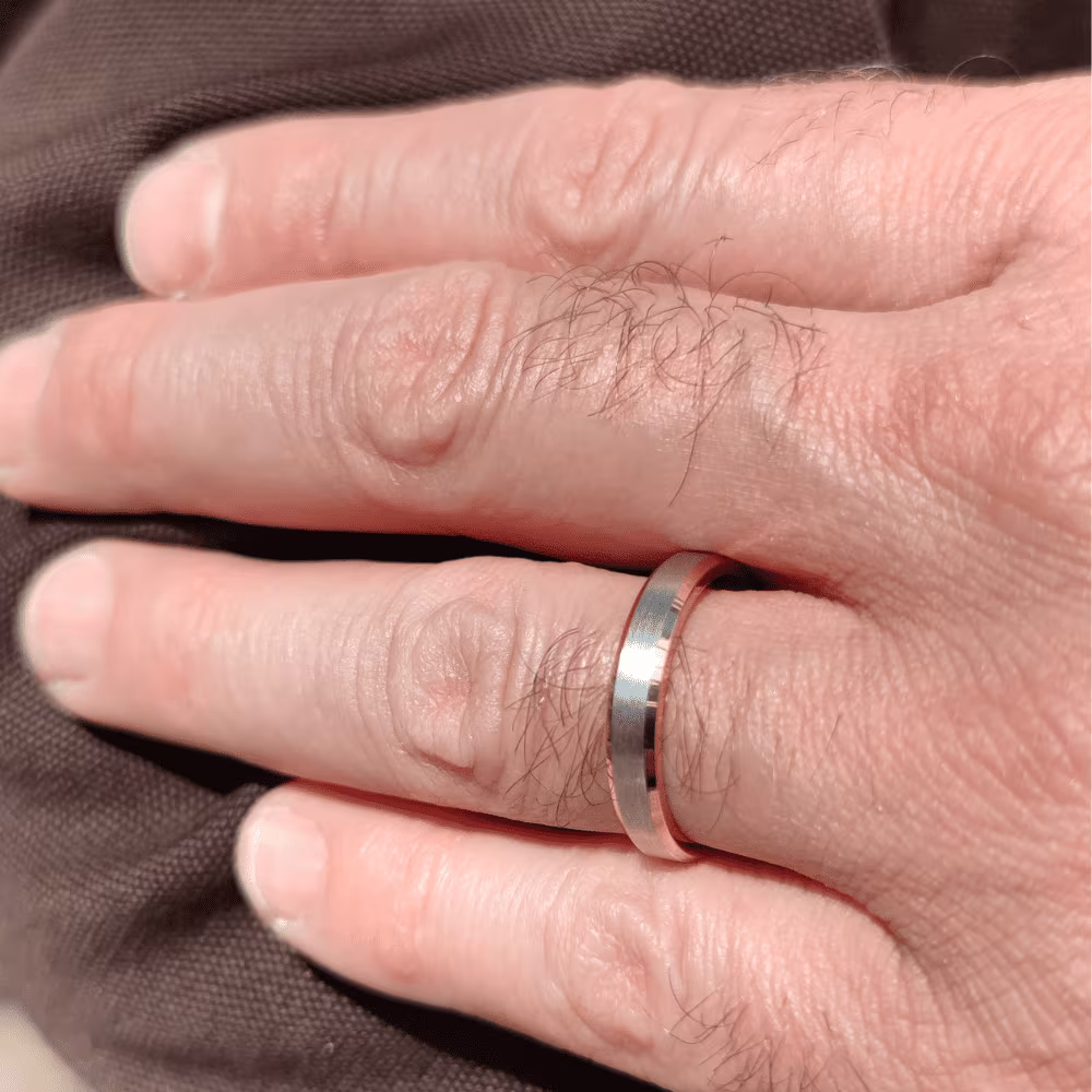 Fabriquée en or 18 carats, cette alliance de mariage haut de gamme est composée d’une base en or rose poli brillant et d’un motif émerisé en or blanc. Les bord sont biseautés pour un rendu plus harmonieux.
