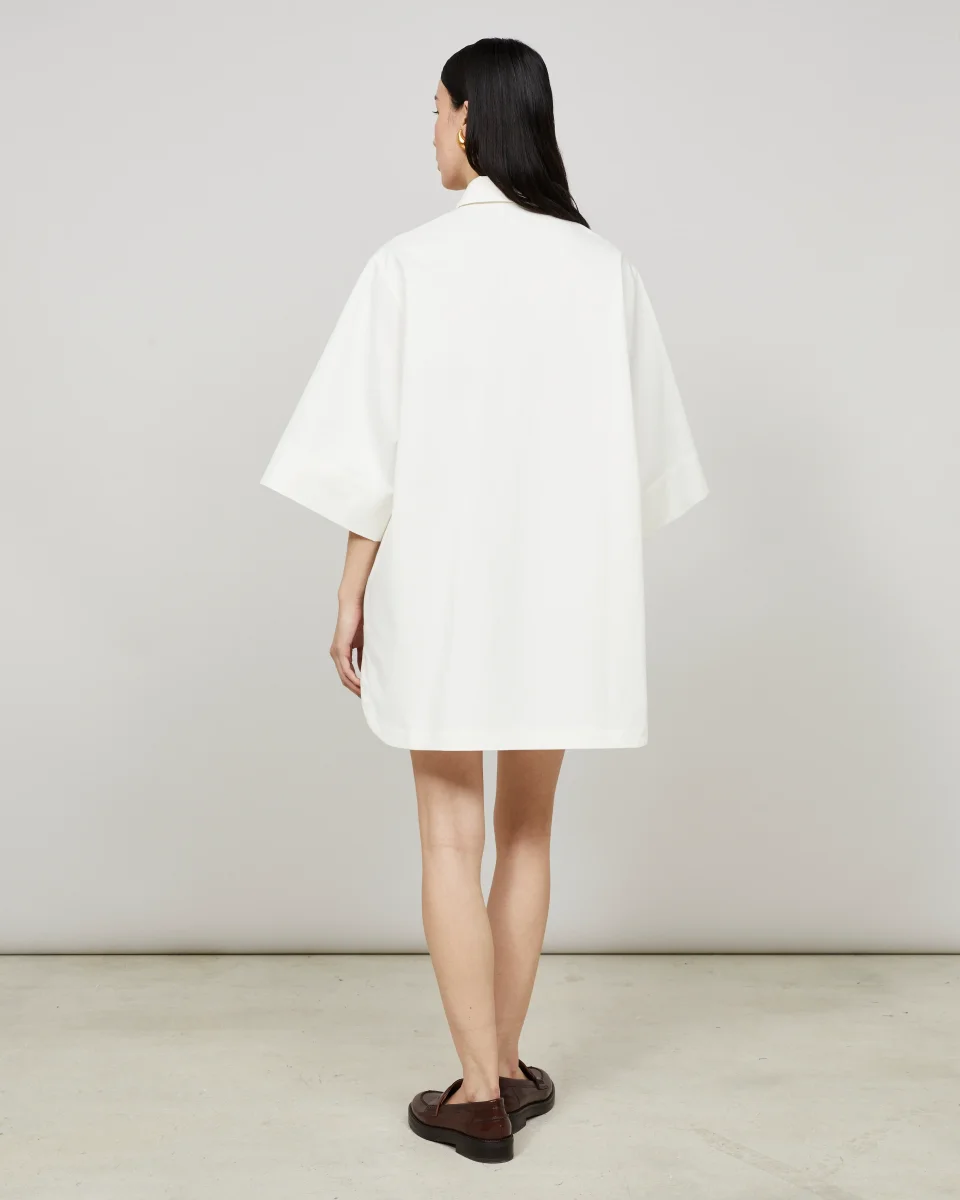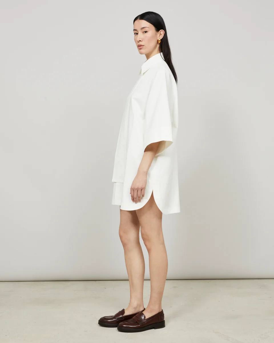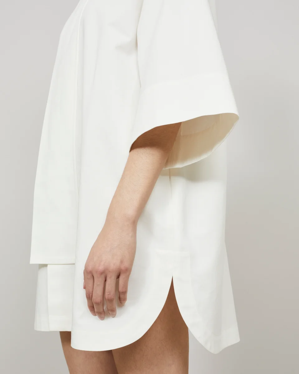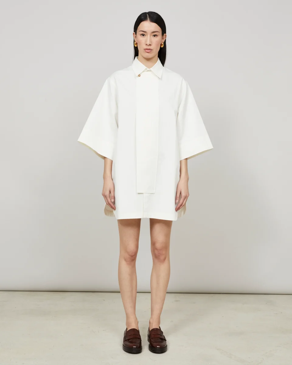 Pièce iconique de notre garde-robe d’été, cette grande chemise est confectionnée dans un mélange de coton et de lin, au toucher soyeux et au tombé structuré. Son volume généreux, ses manches amples et sa patte large à l’effet plastron lui confèrent une allure au chic naturel. Cette chemise présente également un col classique, des poches prises dans les coutures côté et un ourlet liquette, signature de la marque.