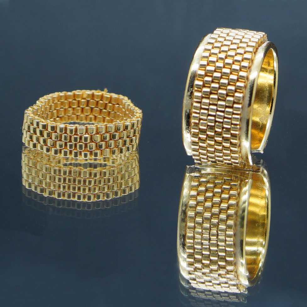 Conçue avec un support en laiton doré à l’or fin (sans plomb, ni nickel), cette bague sublime est ornée de perles Délica Miyuki dorées tissées avec soin sur six rangs.