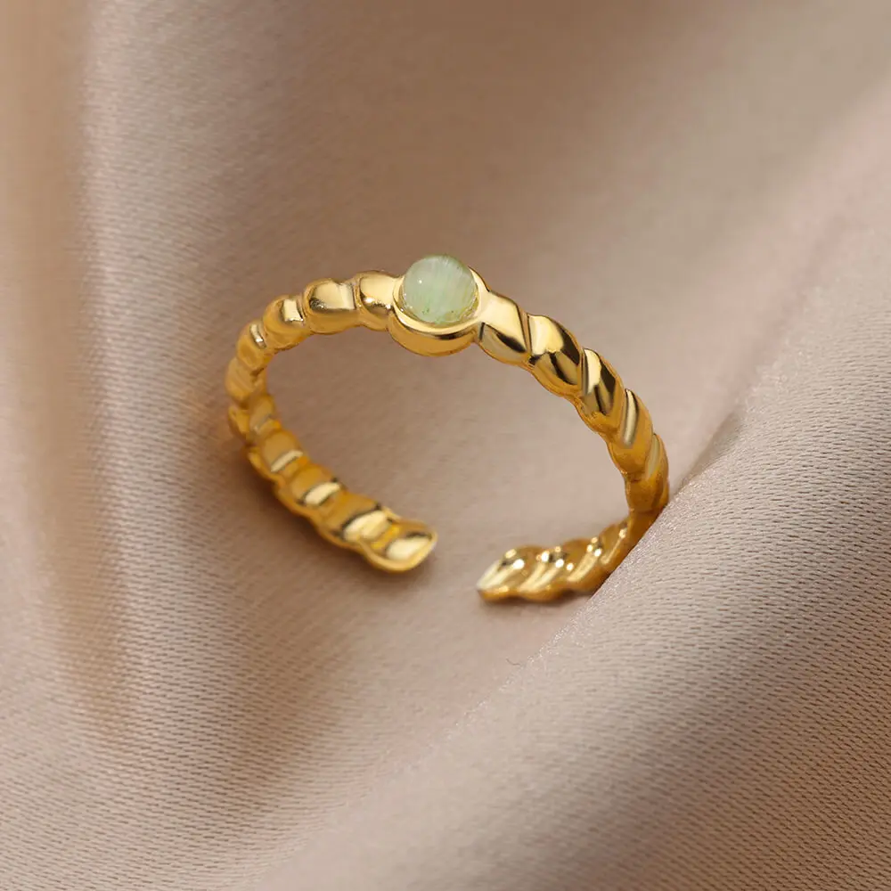 - Pierre Céleste : Cette bague se distingue par un anneau torsadé et fin, orné d’un petit cœur serti de pierres de couleur vert clair.