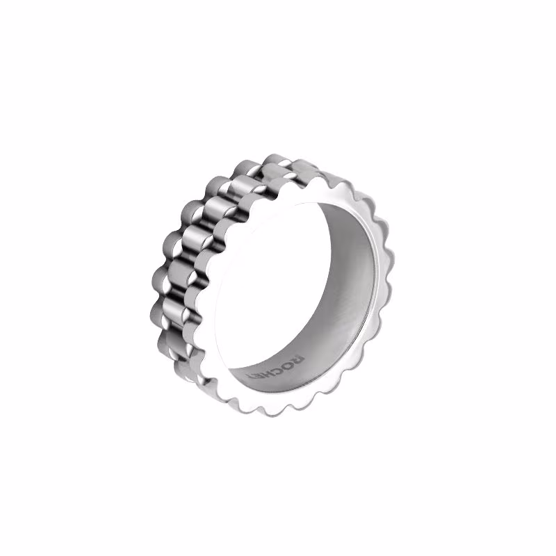 Découvrez sans plus attendre cette bague de 8mm de largeur. Fabriquée en acier inoxydable, elle reprend les motifs styles Président de célèbres marques horlogères.