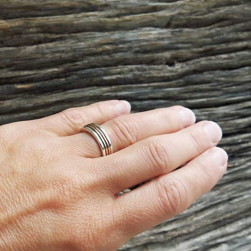 Un anneau de méditation fin, en argent massif, entièrement fait-main. Cette bague au design délicat est composée d’un anneau principal en argent massif et de 2 anneaux fin en laiton et cuivre. La bague Ki est une source de zénitude, car faire tourner les anneaux canalise l’esprit et a un effet apaisant. Son nom vient du japonais, où le ki symbolise l’énergie, la source de vie.