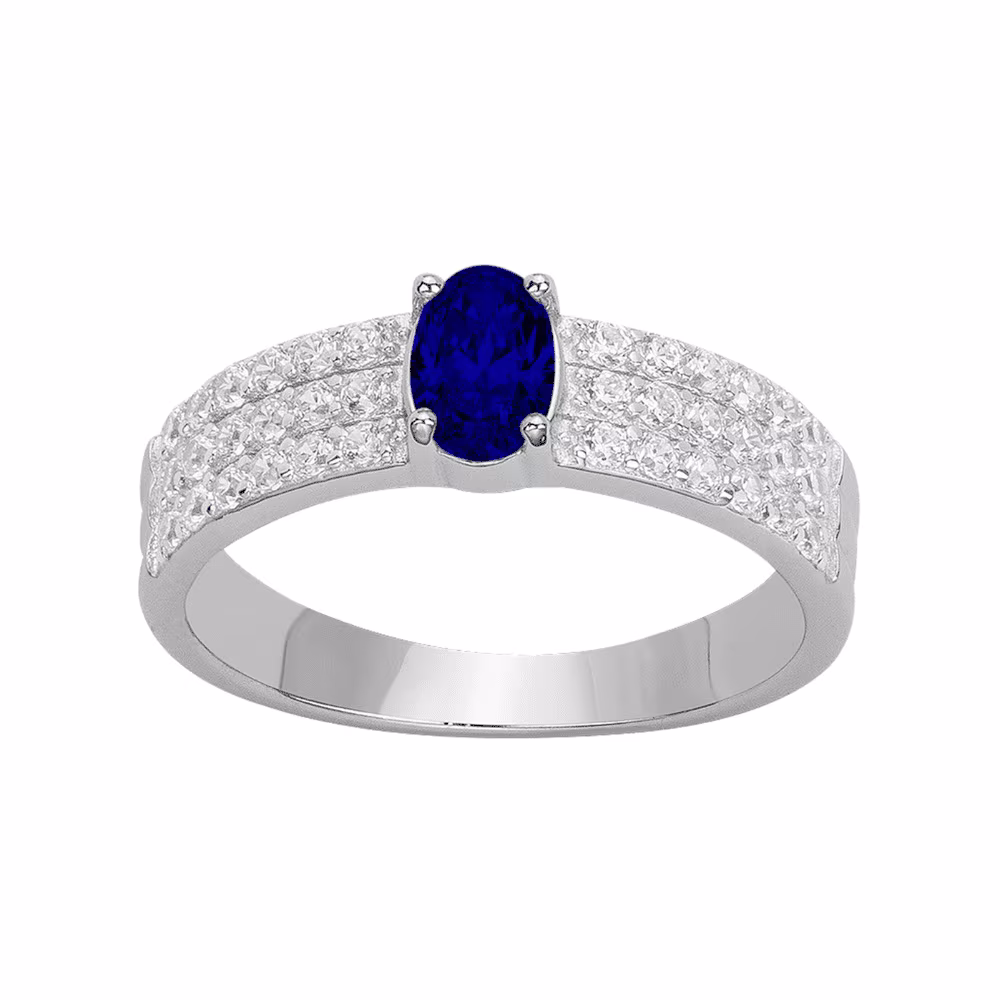 Cette magnifique bague possède trois rangs recentrés à l’avant qui se réunissent dans un superbe pavage d’oxydes de zirconium. Un scintillant oxyde de zirconium bleu orne le bijou et le réhausse par sa couleur éclatante.