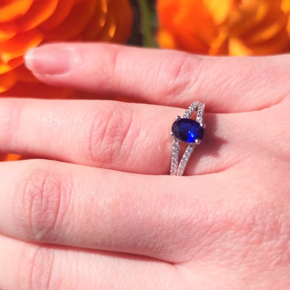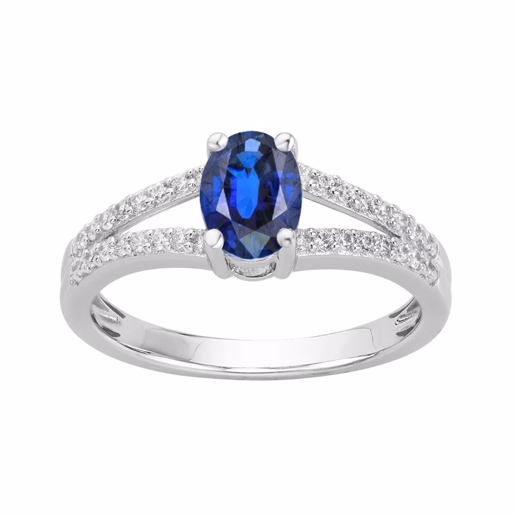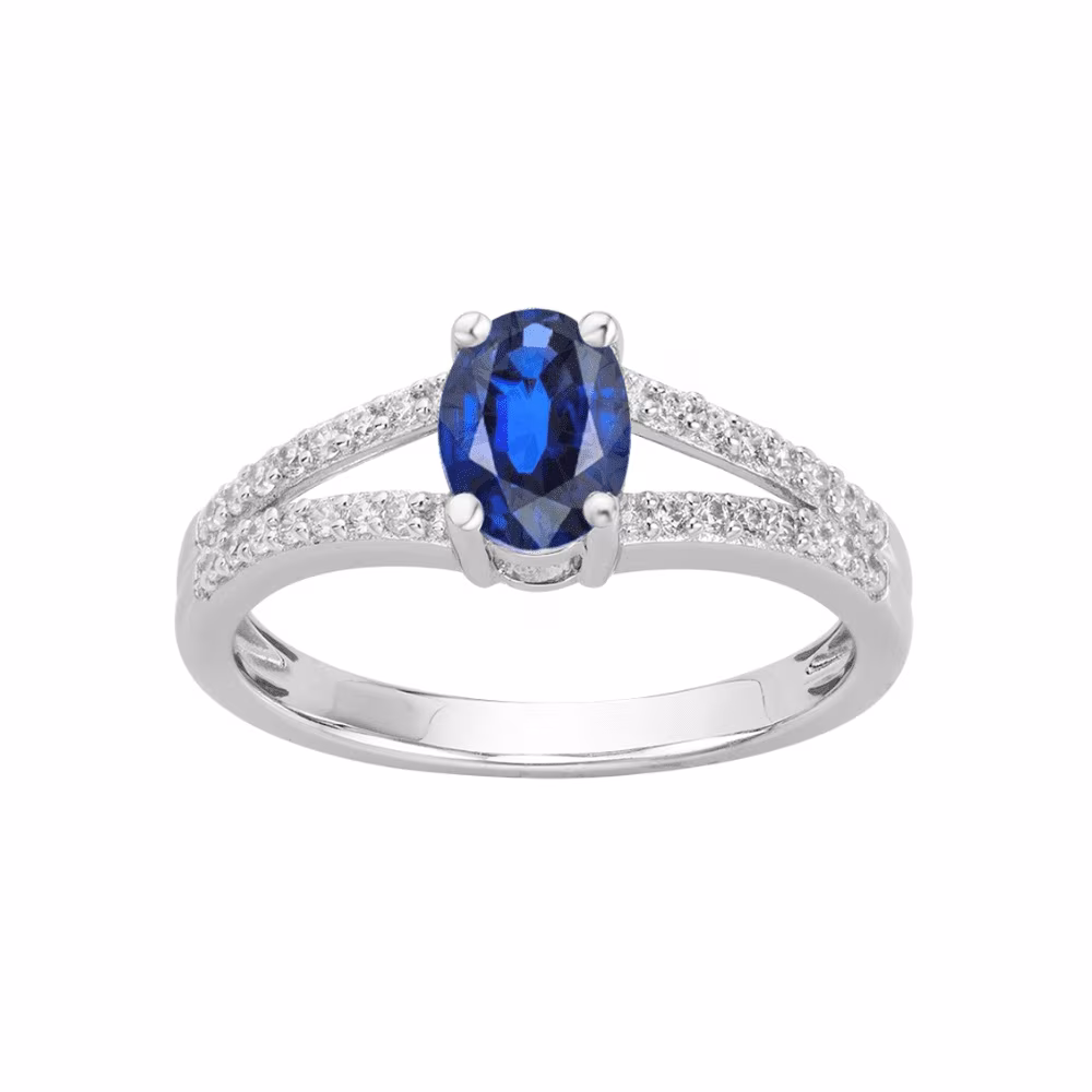 Bague Argent Pierre Bleue Ovale et Rangs Blancs