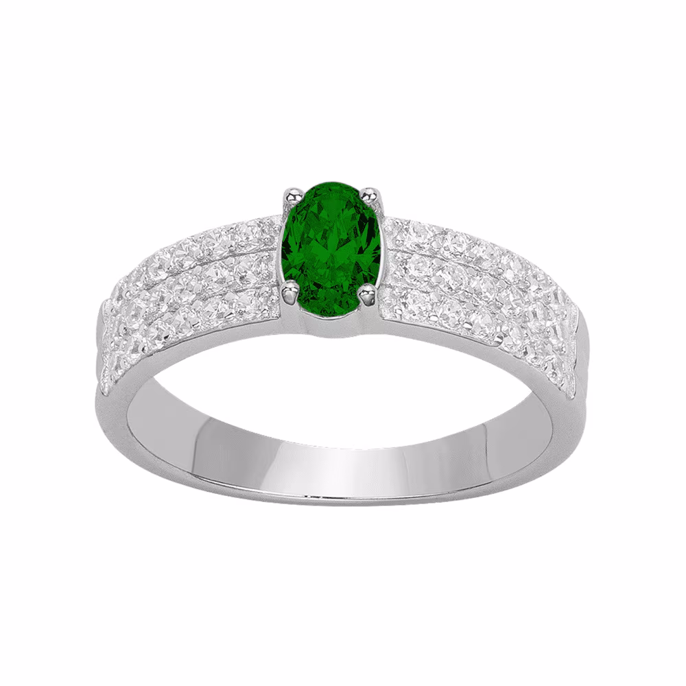 Cette magnifique bague possède trois rangs recentrés à l’avant qui se réunissent dans un superbe pavage d’oxydes de zirconium. Un scintillant oxyde de zirconium vert orne le bijou et le réhausse par sa couleur éclatante.