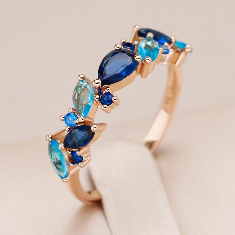 Cette bague bleu est une pièce délicate et raffinée, inspirée de la beauté de la nature. Elle est ornée de plusieurs pierres en zircone cubique de différentes formes (marquise, ronde, ovale) et de différentes couleurs, allant du bleu saphir au turquoise. Les pierres sont disposées en motifs de feuilles et de fleurs. La bague est conçue en cuivre plaqué or 585, et son alliage est conforme à la norme environnementale, étant sans plomb, sans nickel et sans cadmium, ce qui la rend sûre à porter au quotidien.