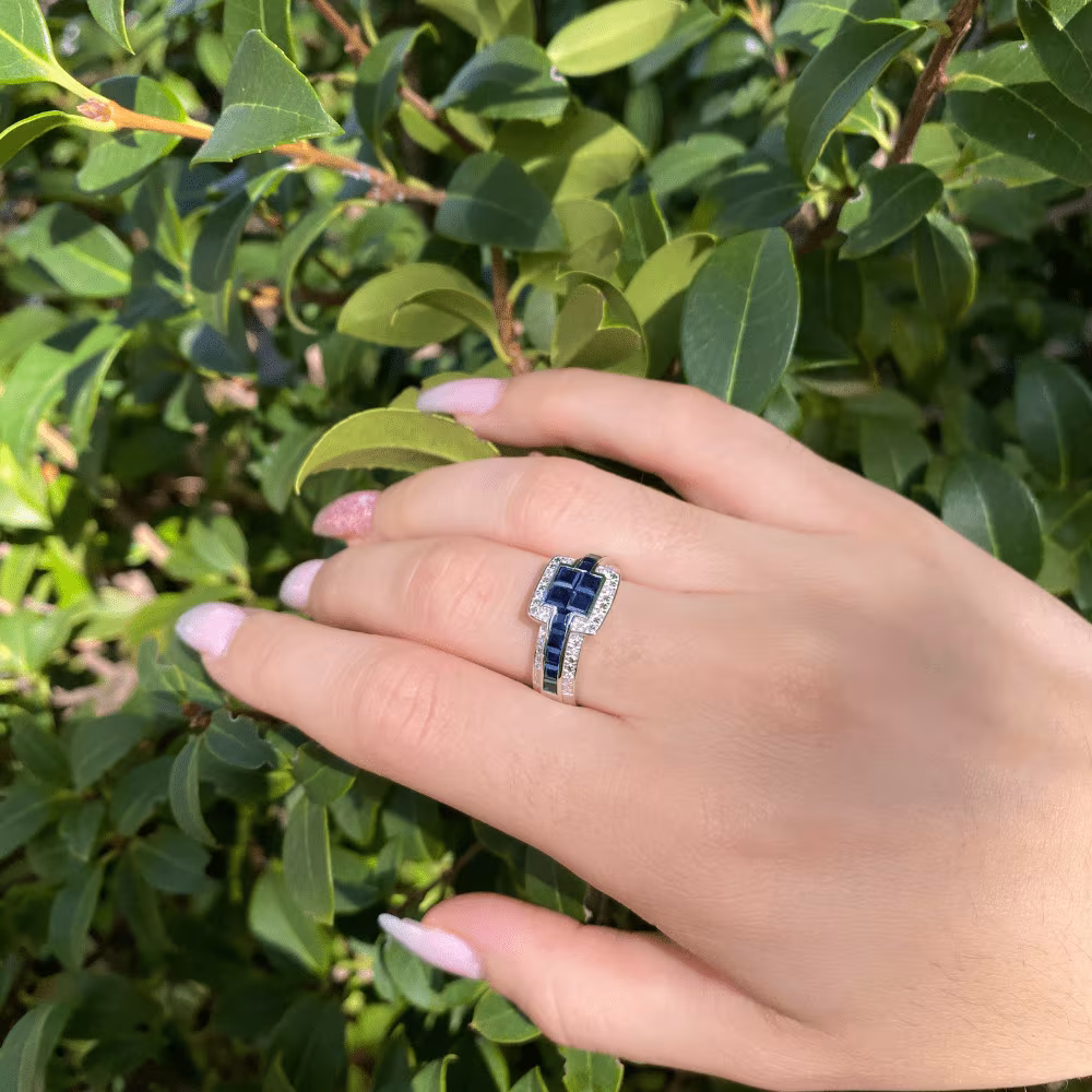 De forme carrée, cette bague en or blanc se compose d’élégant saphir bleus taillés en carrés (appelés saphirs calibrés) et d’un petit entourage en motif diamanté parsemé de 6 diamants.