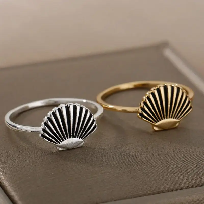 Le modèle présenté se distingue par son motif de coquillage finement stylisé, aux lignes rayonnantes noires contrastant avec une finition dorée lumineuse. La surface est lisse, élégante, parfaitement équilibrée, tandis que l’anneau fin de 2 mm apporte une discrétion raffinée très agréable à porter. La version argentée offre une alternative plus sobre, tout aussi moderne, pour s’adapter à chaque style.
