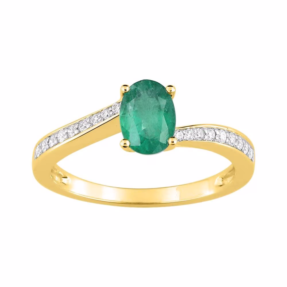 Élégance et raffinement se rencontrent dans la bague Léonie en or jaune 18 carats. Son design sophistiqué met en valeur une émeraude ovale de qualité joaillerie (7x5mm), sublimée par un corps croisé délicatement pavé de diamants pour un total de 0.12ct (qualité GSI).
