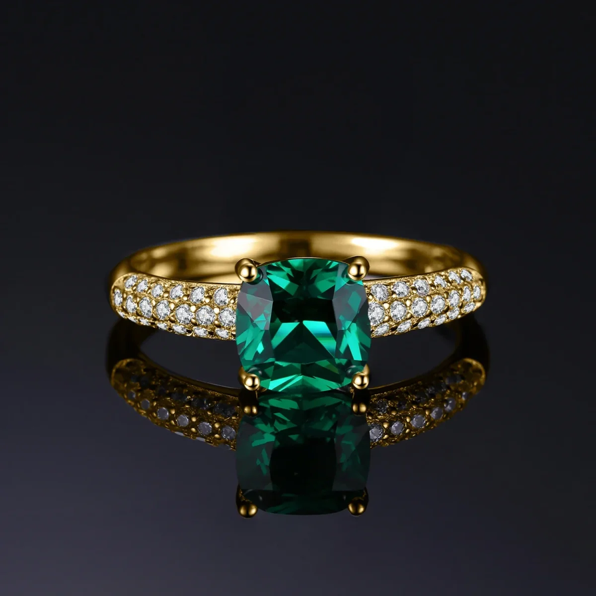 Le modèle se distingue par une conception sophistiquée et lumineuse. Au centre, un coussin d’émeraude, taillé avec précision, révèle un vert profond et vibrant, fermement maintenu par quatre griffes délicates. L’anneau, d’une chaleureuse couleur dorée, est sublimé sur ses épaules par un double rang de petites pierres claires, méticuleusement serties pour capturer la lumière à chaque mouvement. Ces pierres, contrastant avec l’éclat de l’or, soulignent l’opulence de l’émeraude centrale, offrant un design à la fois classique et spectaculaire.