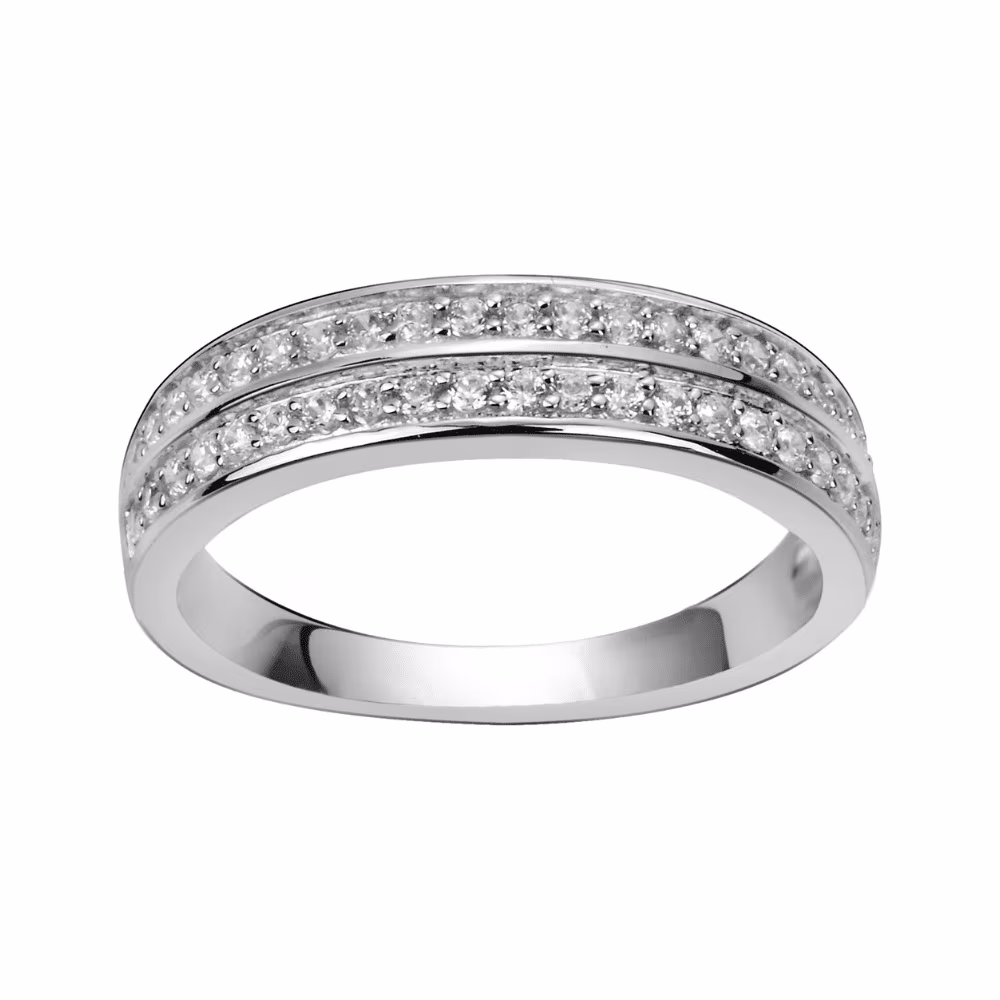 Bague fabriquée en argent rhodié 925/1000 qui se compose de deux rangées de 20 oxydes de zirconium chacune.