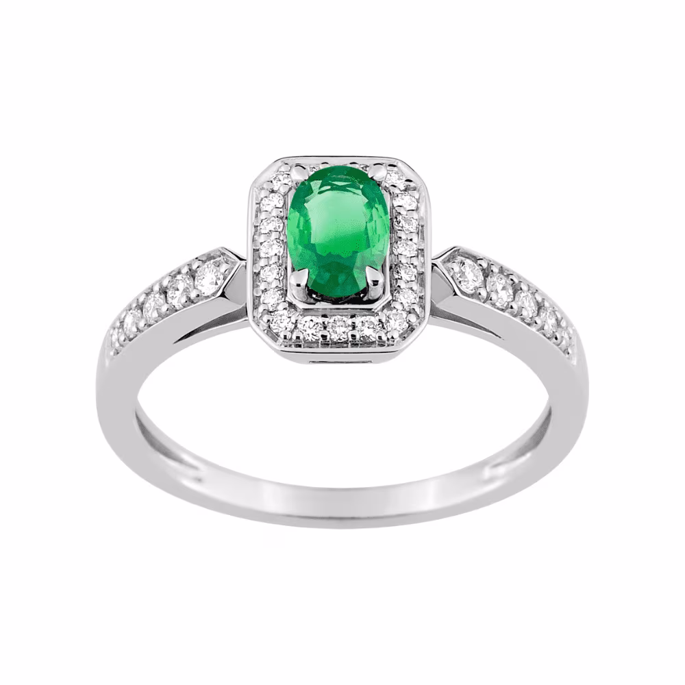 Cette bague Charline met à l’honneur une émeraude ovale de dimension 6×4 mm pour un poids de 0.43 carats.