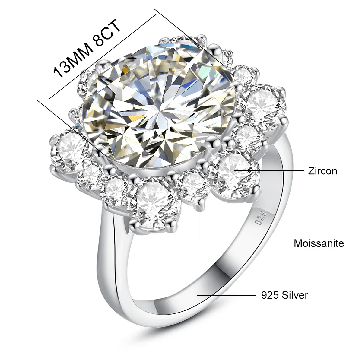 Le cœur de ce bijou est une magnifique Moissanite de 8 carats, la pierre principale réputée pour son feu et son éclat qui surpassent ceux du diamant. Elle est merveilleusement accompagnée de Zircons qui forment la corolle latérale, ajoutant une lumière supplémentaire au design en fleur. L’ensemble a un poids agréable de 6,7 grammes, assurant une présence confortable et luxueuse à votre main.
