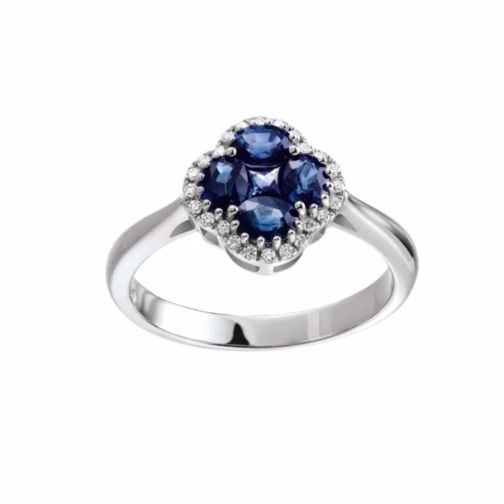 Conçue en or blanc 18 carats, elle met en valeur un saphir Ceylan calibré en son centre, d’un diamètre de 2.5 mm pour un poids de 0.14 carat. Ce joyau est sublimé par quatre saphirs Ceylan ovales de 4 x 3 mm, totalisant 1 carat, qui rappellent la délicatesse des pétales d’un nénuphar.