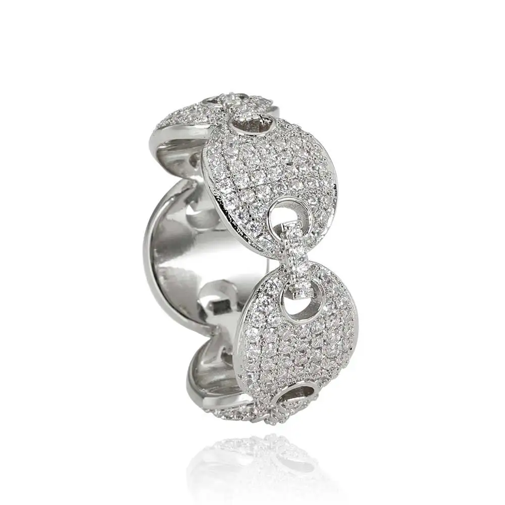 Cette bague est magnifiquement déclinée en deux teintes sublimes. Le premier modèle affiche une finition argentée lumineuse, rehaussant les maillons en forme de graine de café, dont la surface est entièrement pavée de micro-cristaux étincelants. À ses côtés, la version dorée offre une richesse et une chaleur incomparables, son métal précieux enveloppant la même structure détaillée et le même éclat somptueux des zircons. Les deux modèles partagent un design ouvert, où les deux motifs de grains de café sont connectés par un anneau lisse et poli, créant une courbe harmonieuse et un volume séduisant.