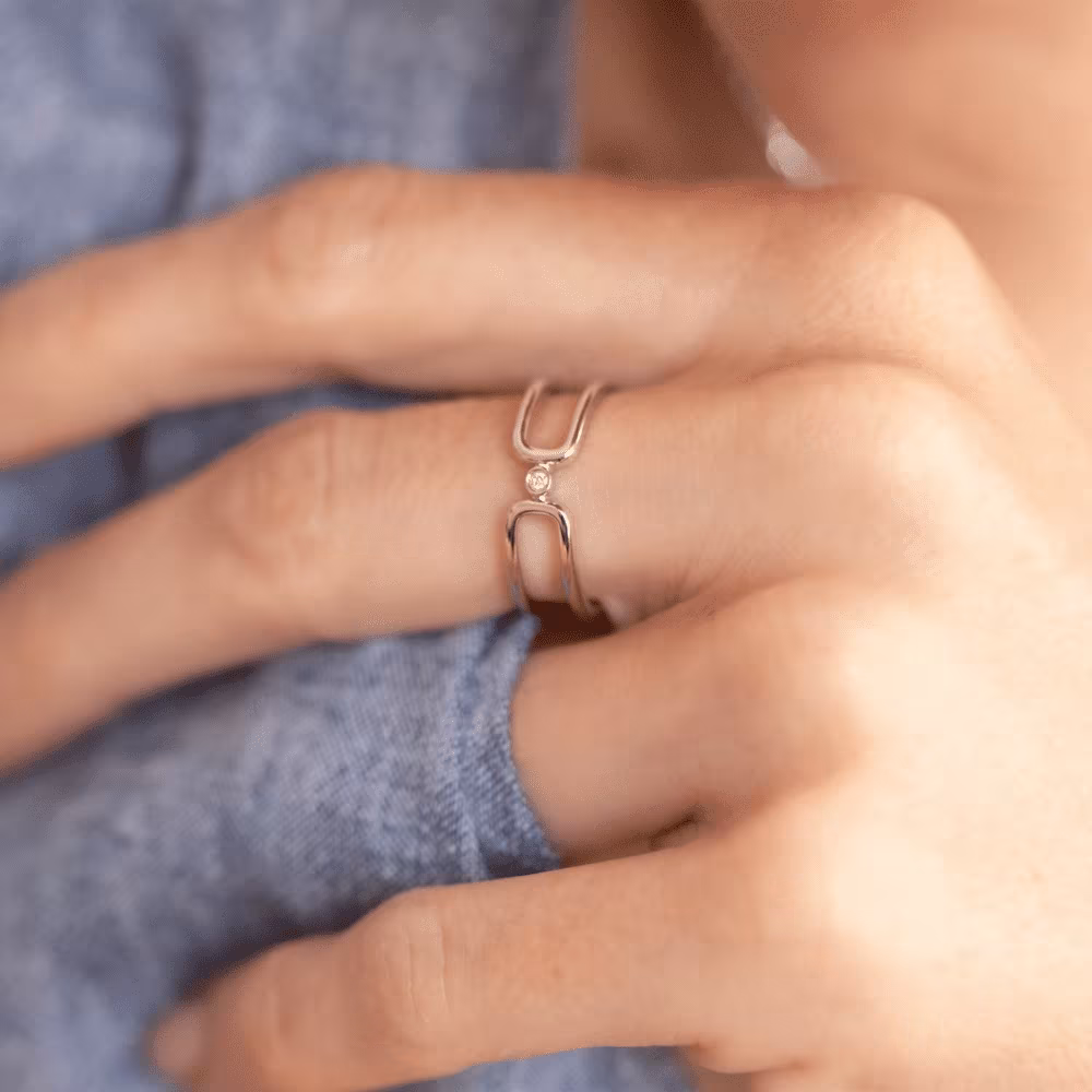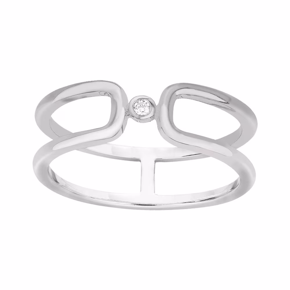 Cette jolie bague ajourée La Garçonne Harmonie se compose de deux branches réunies au centre par un diamant de 0.015ct en serti clos.