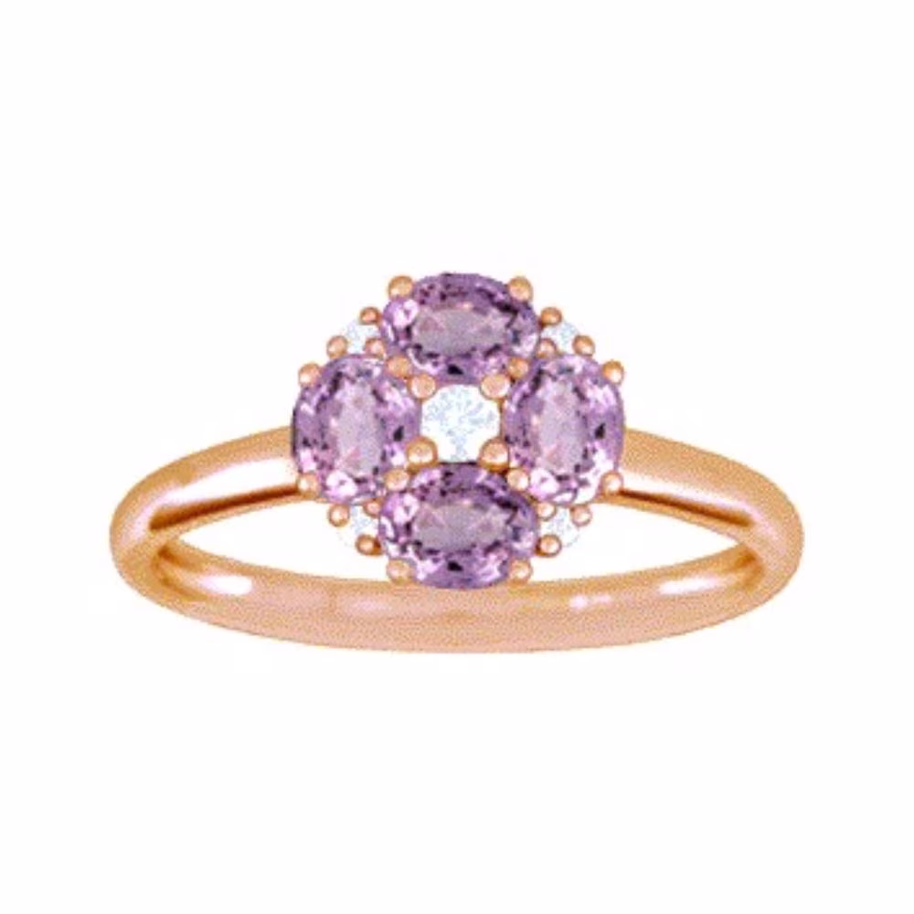 Fabriquée en or rose 18 carats, cette bague rayonne d’une lueur douce et chaleureuse, idéale pour sublimer toutes les carnations. Cette création remarquable est ornée de quatre saphirs violets ovales totalisant 1 carat, disposés de manière harmonieuse autour d’un centre étincelant. Les saphirs roses, symboles de tendresse et de passion, ajoutent une touche de couleur délicate et charmante. Cinq diamants scintillants, dont un central, accentuent l’éclat de la bague.