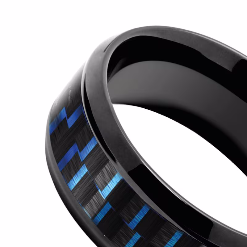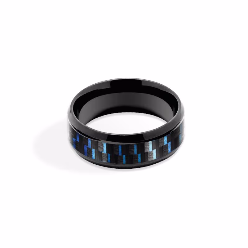 - Design Élégant : Le mélange subtil d’acier teinté noir et de carbone noir et bleu au centre crée un contraste saisissant et un design contemporain qui ne passera pas inaperçu.