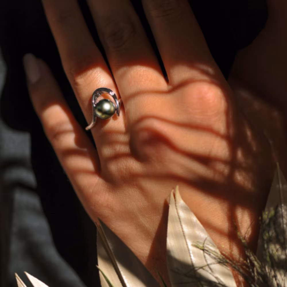 En son centre, une perle de Tahiti d’une taille de 8/9 mm est mise en valeur par un délicat jeu de lignes enroulées. De plus, de petits diamants de 0.01 ct ajoutent une touche lumineuse et précieuse, renforçant l’élégance du bijou.