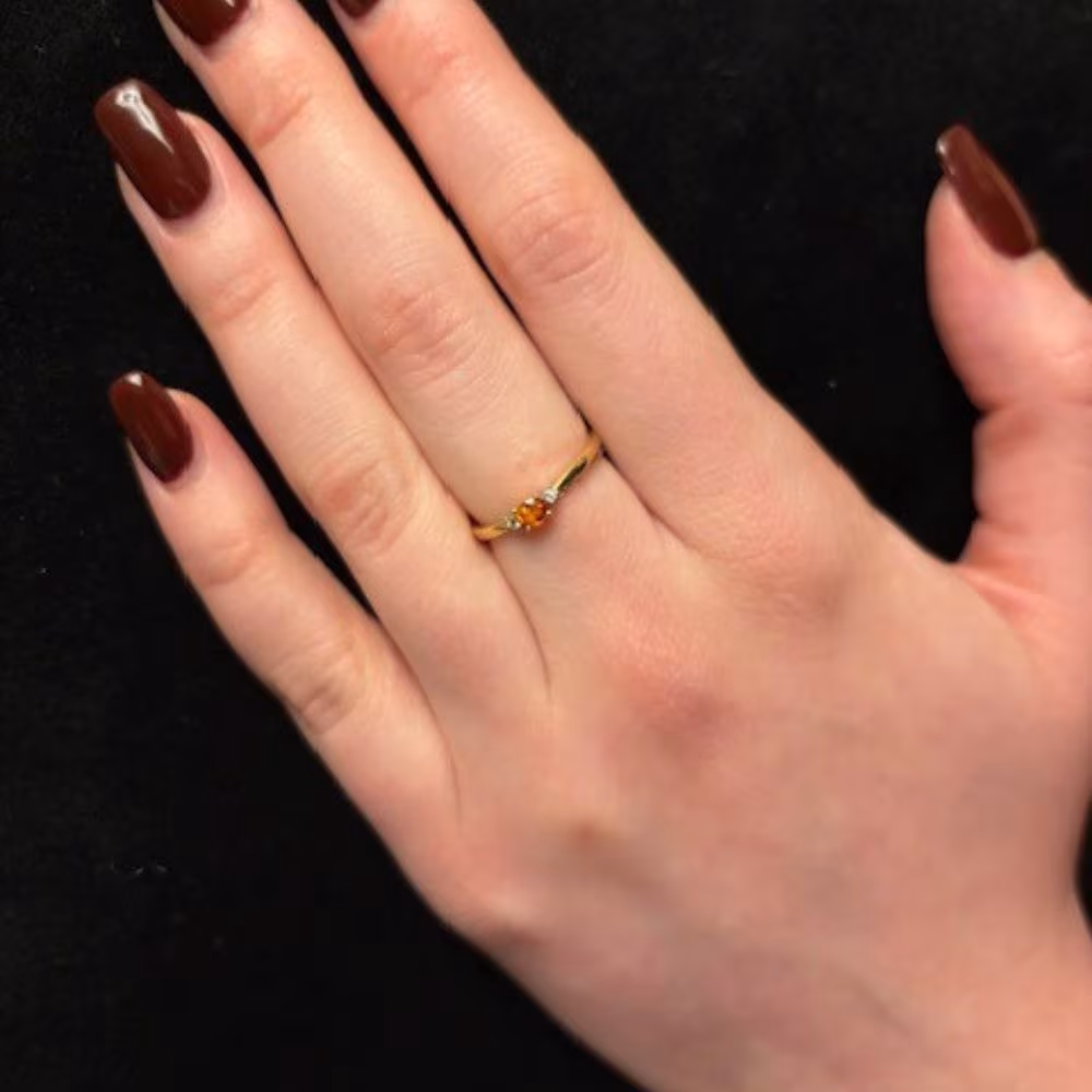 De chaque côté du saphir, la bague est délicatement agrémentée de deux petits diamants scintillants. Ces diamants ajoutent une subtile brillance et soulignent l’éclat du saphir orange, créant une harmonie visuelle captivante.