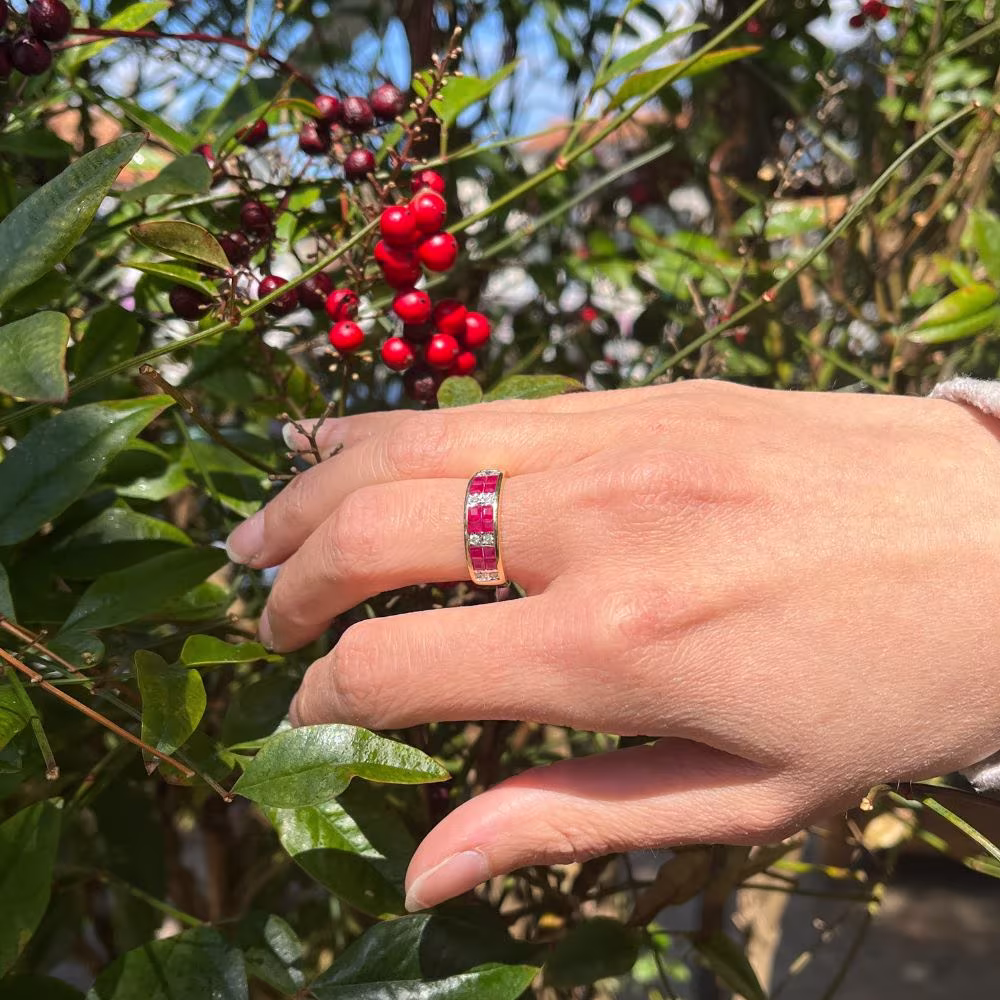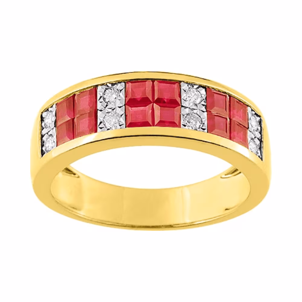 Offrez et découvrez cette magnifique bague large en or jaune 18 carats. La monture de cette bague pèse 4,30 grammes d’or, ce qui lui donne une sensation de solidité et de durabilité. Cette bague est ornée de 12 rubis calibrés pour un total de 1,260 carats, ainsi que de 8 diamants pour un total de 0,12 carats. Les rubis apportent une touche de couleur vive et chaude, tandis que les diamants ajoutent un éclat subtil qui capture la lumière à chaque mouvement. Le design de la bague est à la fois élégant et audacieux, avec son corps large et son motif en rubis et diamants, ce bijou attire instantanément le regard. Cette bague est parfaite pour toutes les occasions, qu’il s’agisse d’un mariage, d’un anniversaire ou simplement d’un jour spécial où vous voulez surprendre votre bien-aimée.