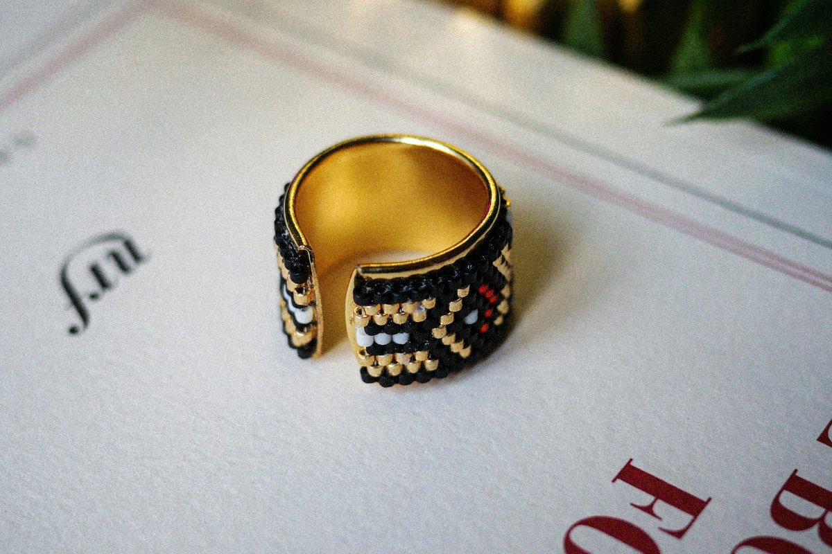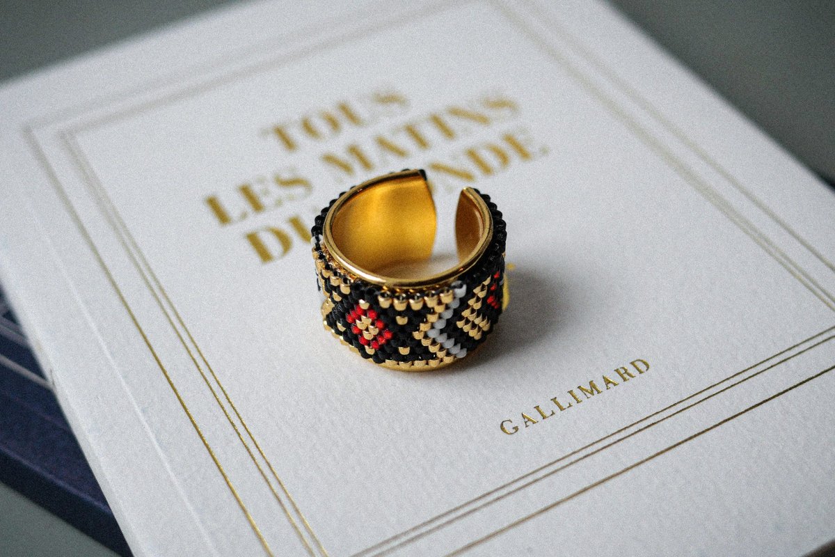 La bague Madison incarne tout le glamour de Broadway : un tissage noir profond, relevé de touches or et rouge rubis, comme les lumières d’un théâtre au cœur de Manhattan. Montée sur une bague réglable dorée à l’or fin, elle apporte une allure dramatique et irrésistiblement chic à chaque geste.
