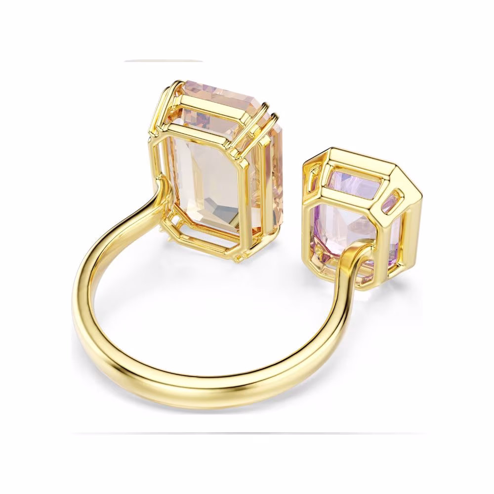 Apportez une touche d’élégance audacieuse à votre style avec cette bague cocktail asymétrique de la collection Millenia. Son anneau ouvert au placage de ton or met en valeur deux cristaux éclatants : un cristal violet serti chaton d’un côté et un cristal caramel dans un double sertissage griffes de l’autre.