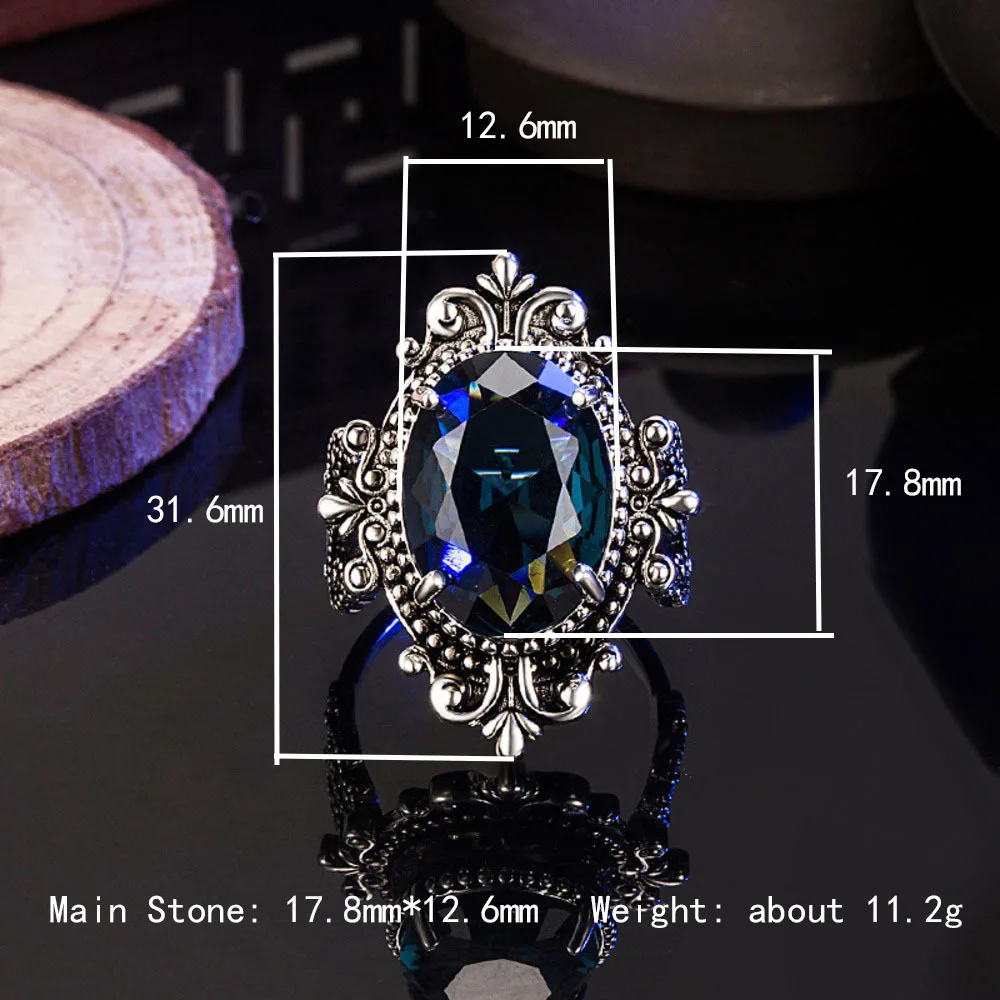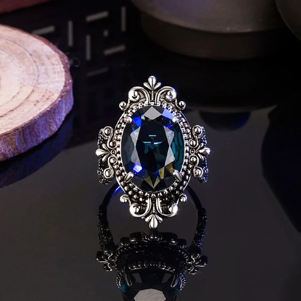 Ce bijou n’est pas qu’un simple ornement, c’est un fragment d’histoire à votre doigt, capable d’évoquer l’opulence des cours royales et le raffinement d’une autre époque. Sa présence captivante saura séduire les amatrices de pièces fortes et les collectionneurs avisés. Cette bague saphir ancienne se distingue par une monture imposante et ouvragée en argent sterling 925, dont le motif à volutes et le sertissage de billes fines autour de la pierre principale rappellent l’esthétique riche et détaillée de l’art baroque ou du style victorien.