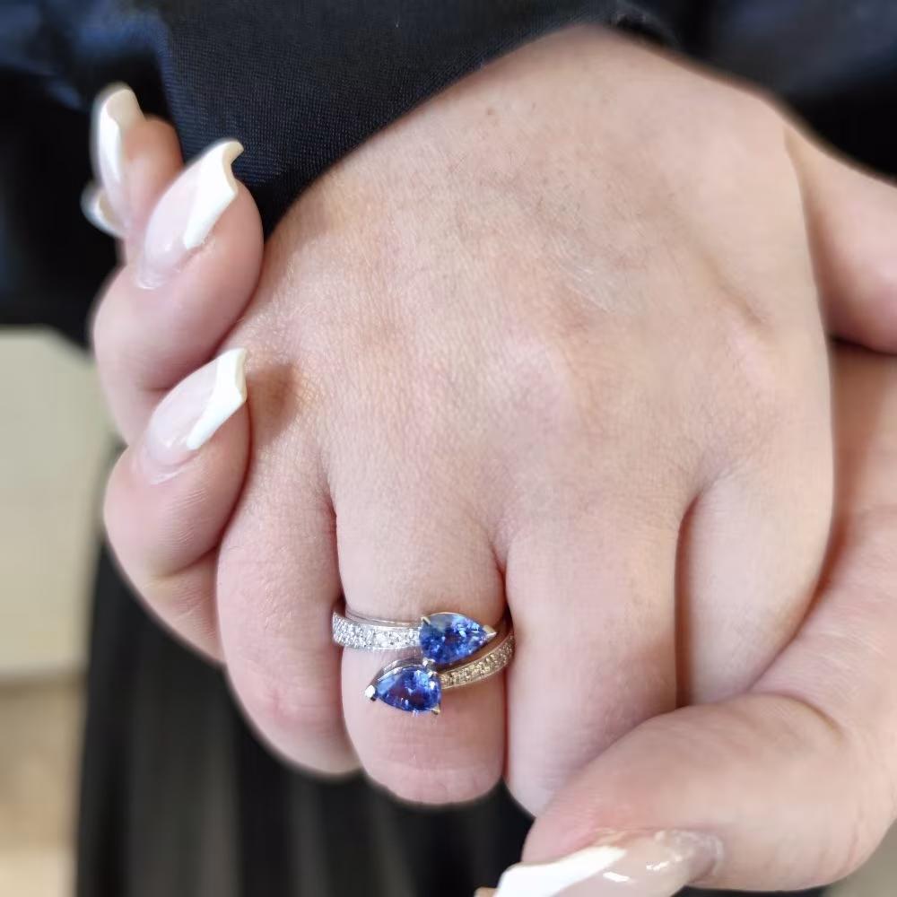 Cette bague comporte deux saphirs de Ceylan en forme poires de 1 carat chacun. Leur couleur bleu profond saisit le regard à chaque coup d’œil.