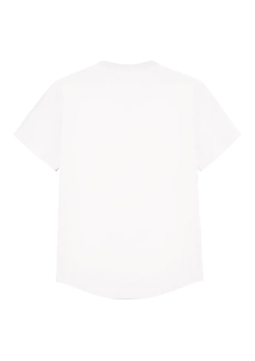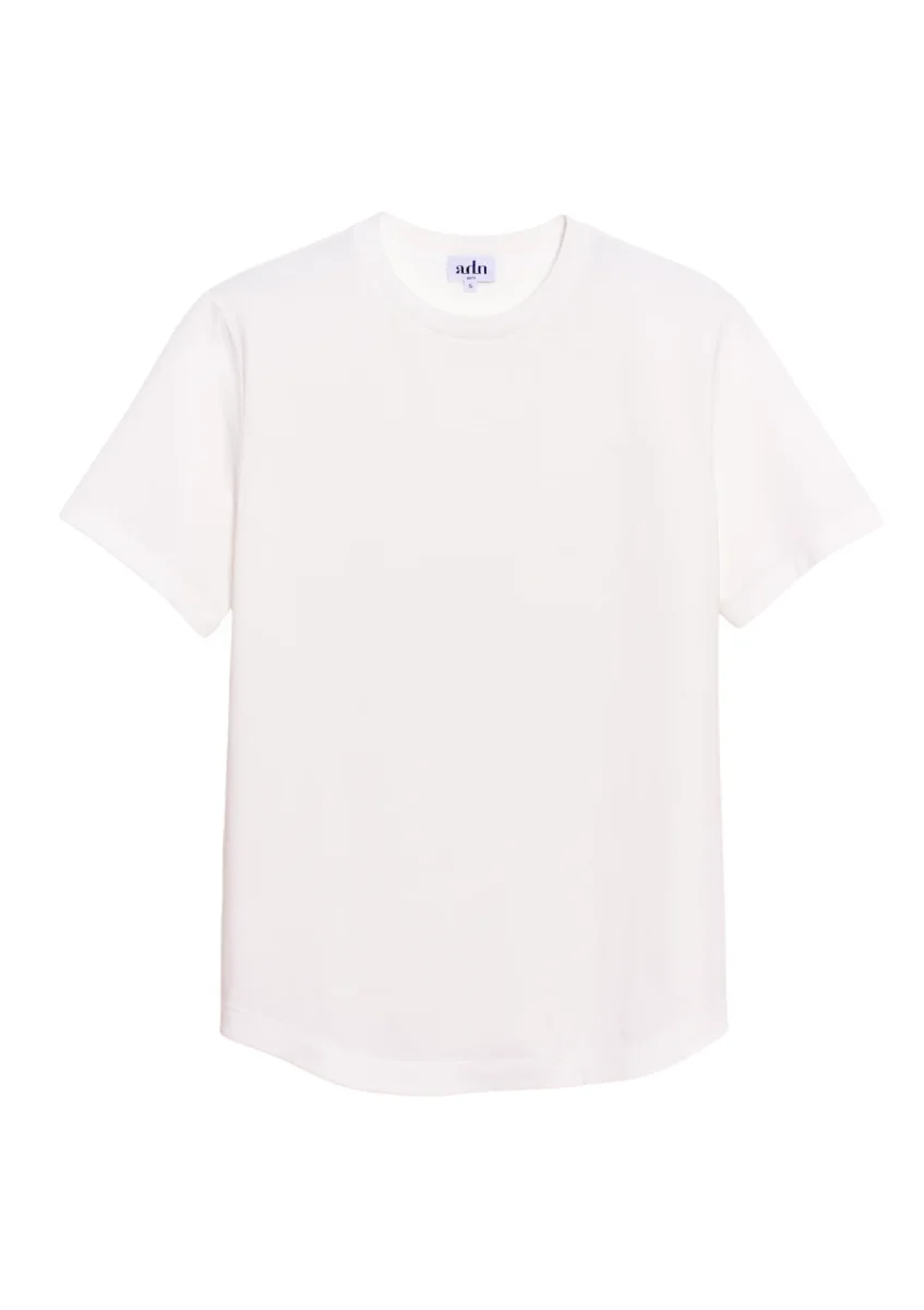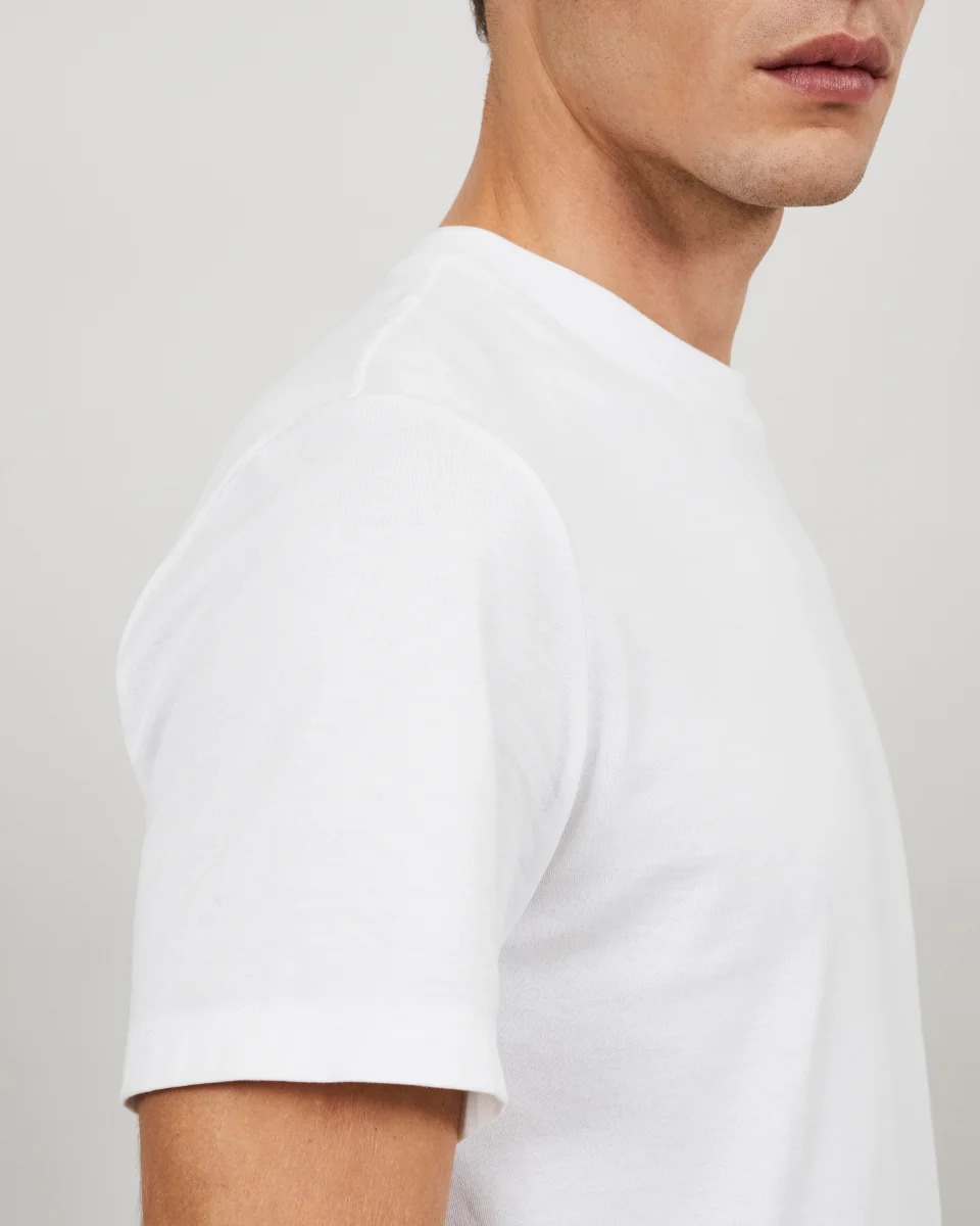 Ce T-shirt est un modèle unisexe réalisé dans un jersey de coton égyptien de poids moyen, à la main compacte et très douce. Ce T-shirt à manches courtes a une coupe droite classique et une encolure ronde à finition côtelée. Il présente un ourlet liquette surpiqué, signature de la marque.