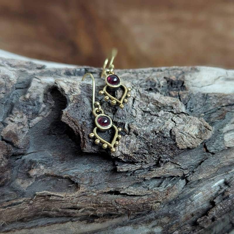 Les boucles d’oreilles grenat BOHÈME ont été entièrement fait-main. Un fil de laiton, savamment travaillé, évolue en courbes bohèmes. Deux petites pierres de grenat rouge cerise viennent compléter ces jolies boucles.