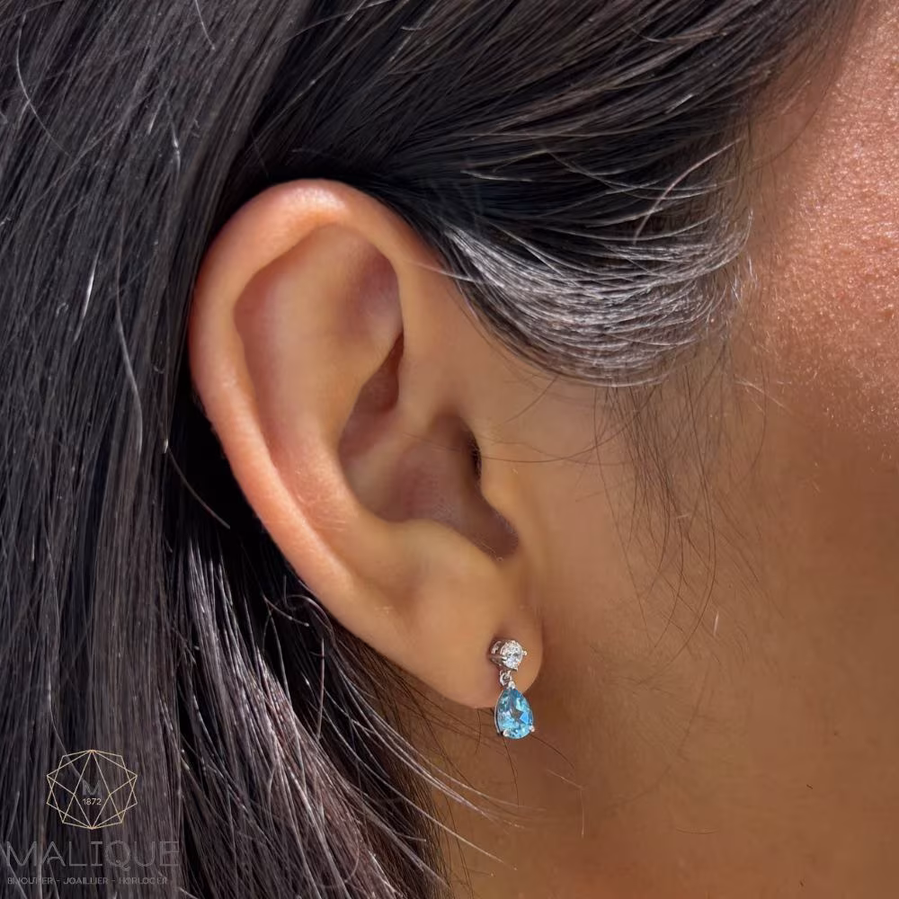 Ces boucles s’accordent parfaitement avec le collier pendentif topaze bleue assorti, pour une parure harmonieuse et lumineuse.