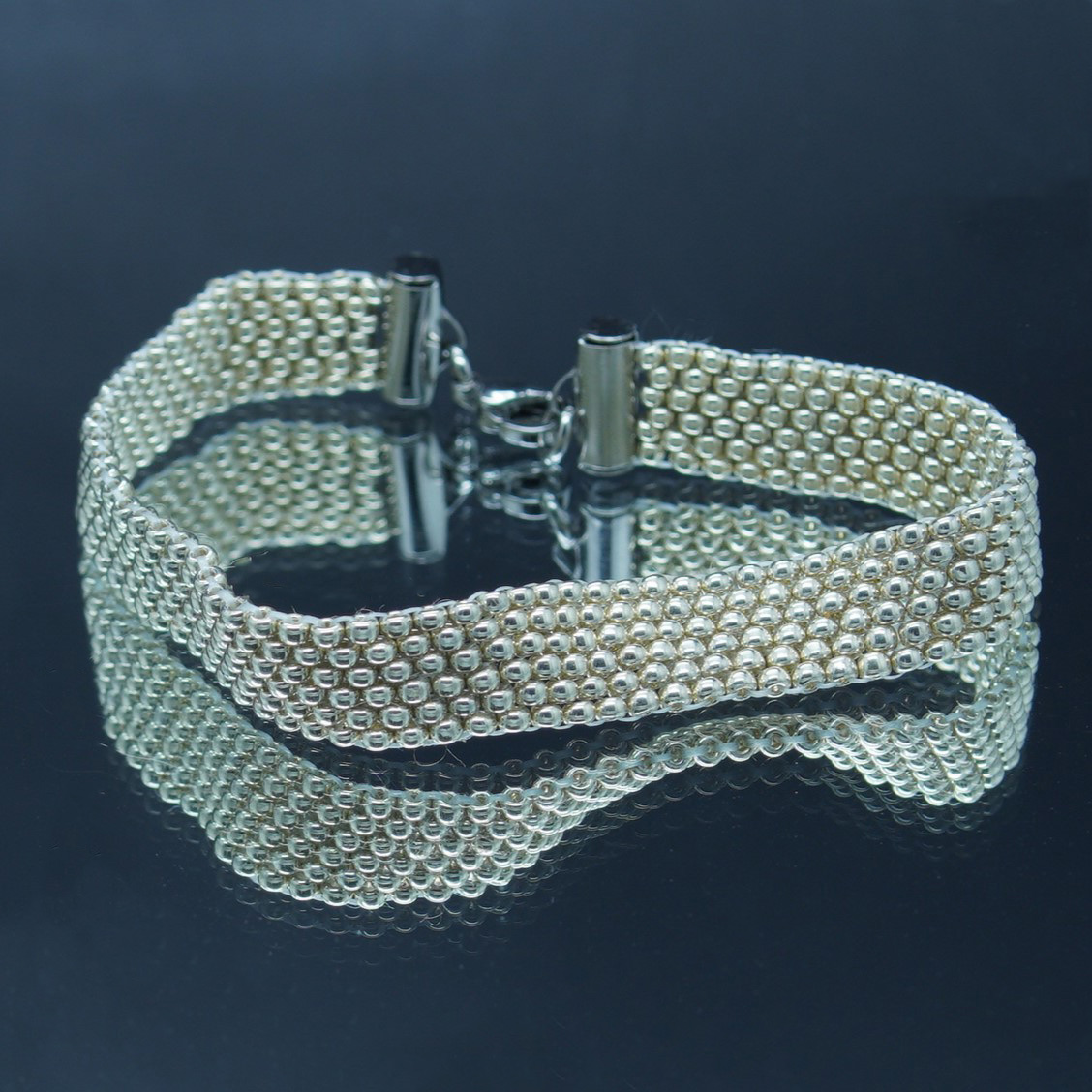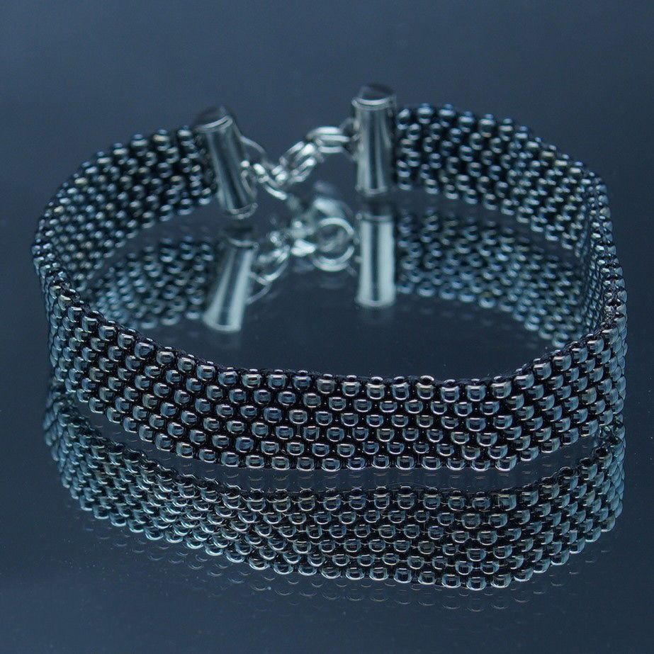 Composé de perles de rocaille minutieusement tissées à la main sur six rangs, ce bijou révèle un jeu de textures et de lumière qui sublime chaque mouvement. Son éclat subtil et son design raffiné en font un accessoire à la fois délicat et tendance.