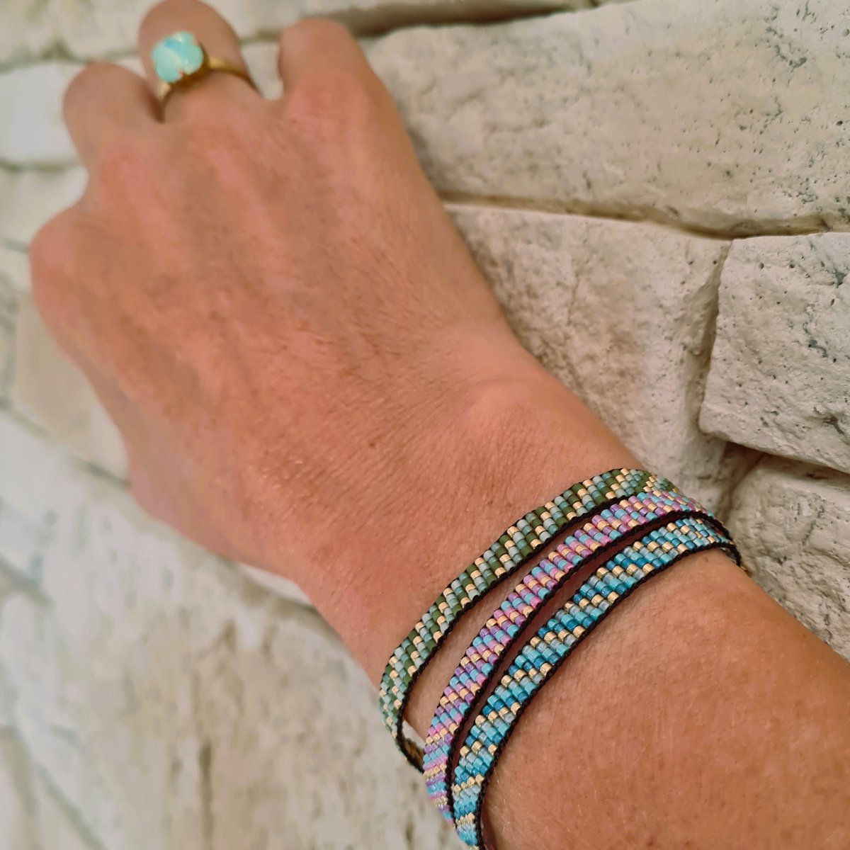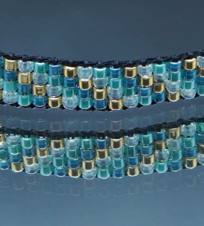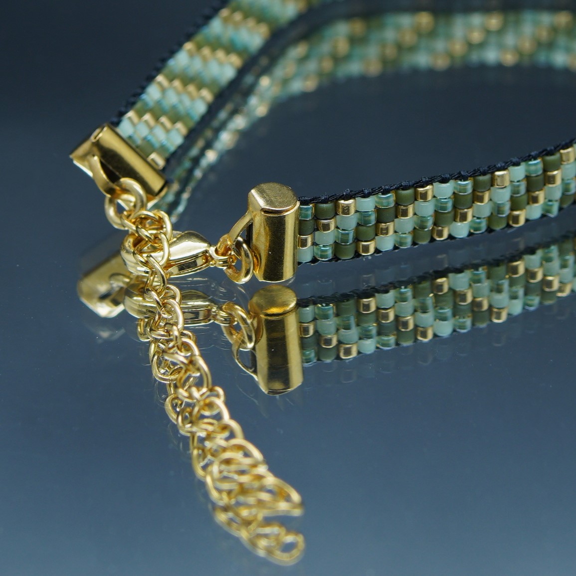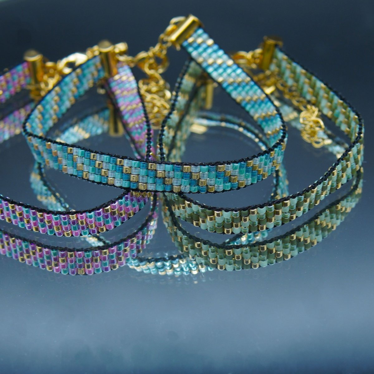 Fabriqué en Provence avec des perles Delica Miyuki sur quatre rangs, il incarne la richesse des motifs mosaïques, reflétant un subtil jeu de couleurs et de textures.