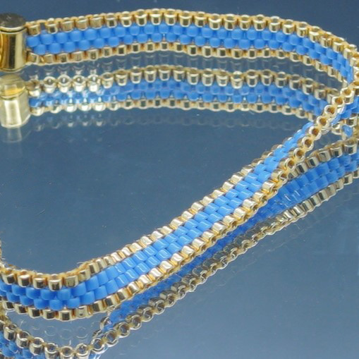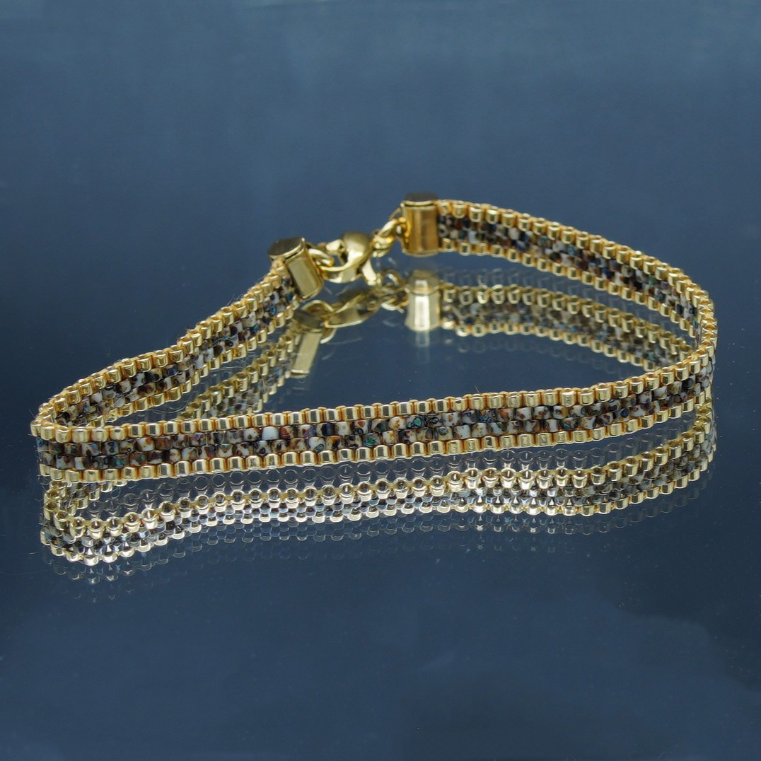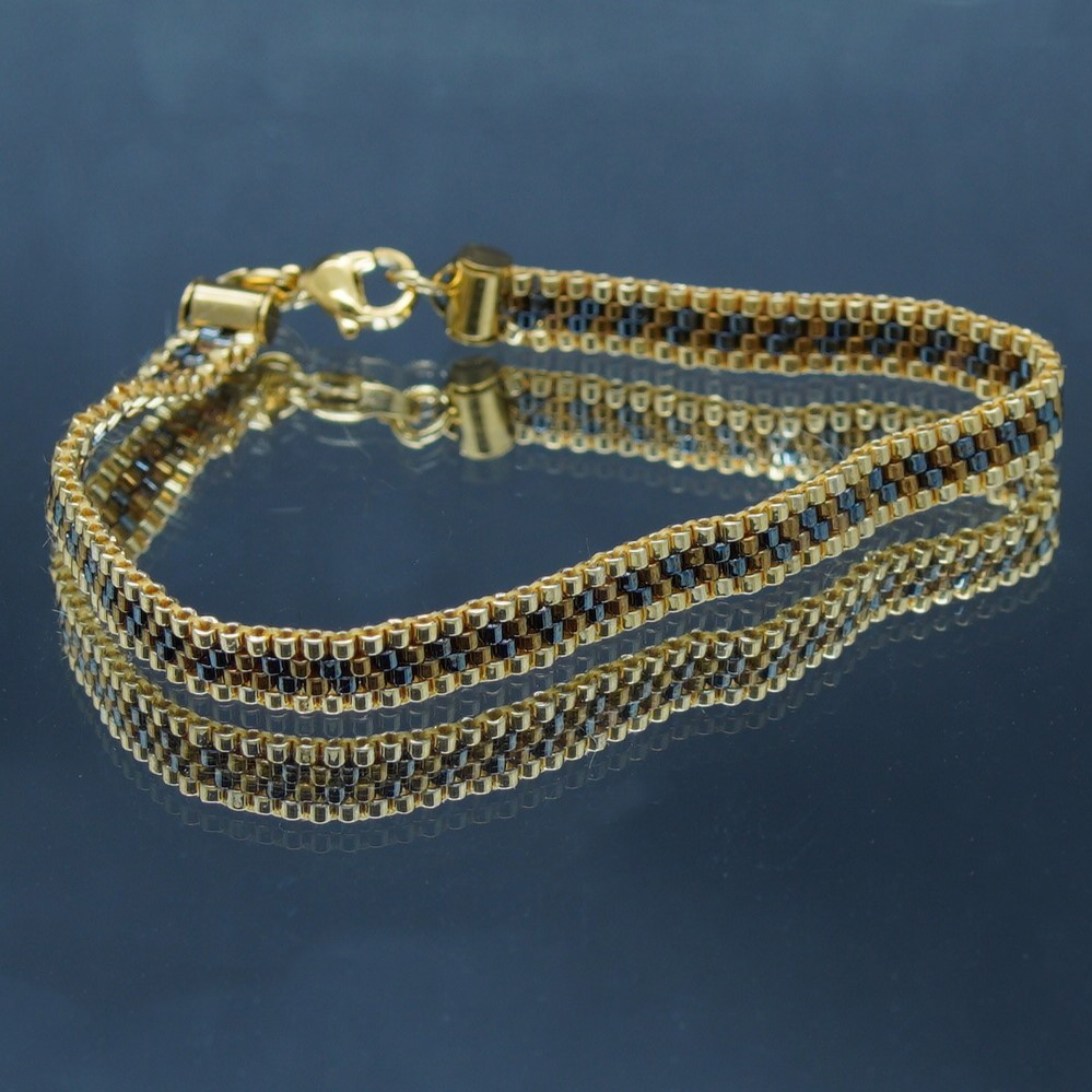 Composé de perles Delica Miyuki minutieusement tissées sur quatre rangs, ce bracelet allie finesse et éclat avec son jeu de couleurs profondes et dorées.
