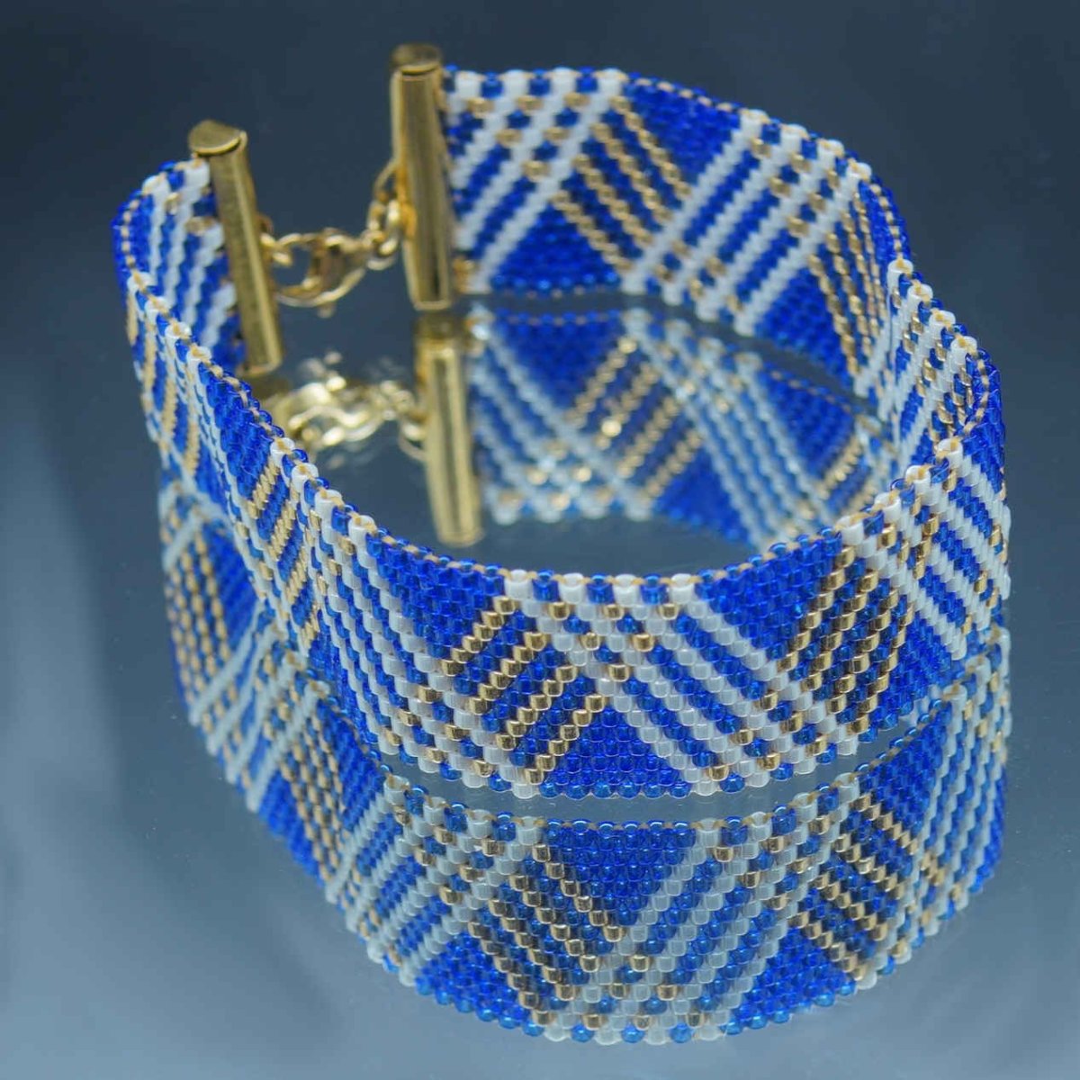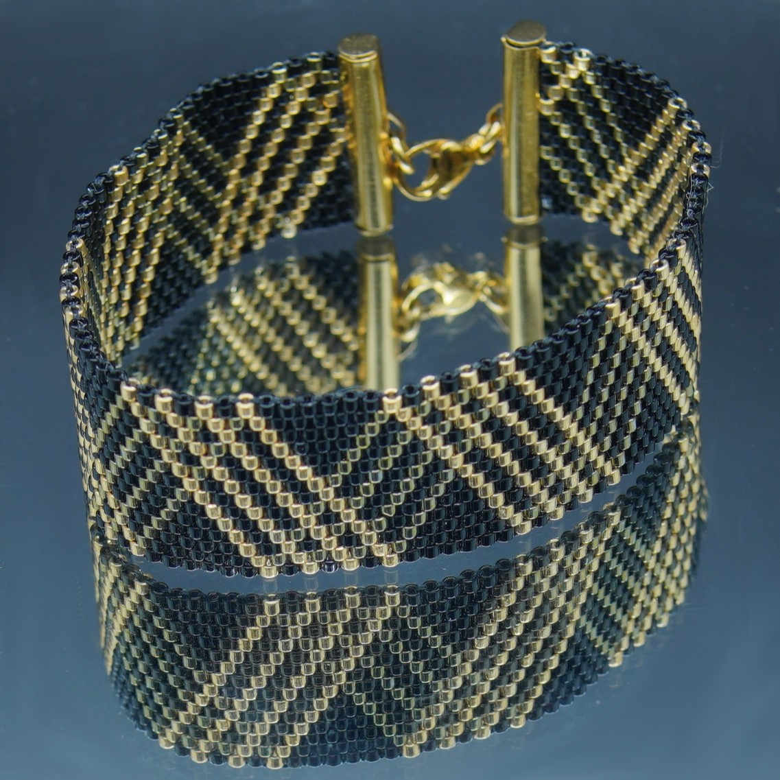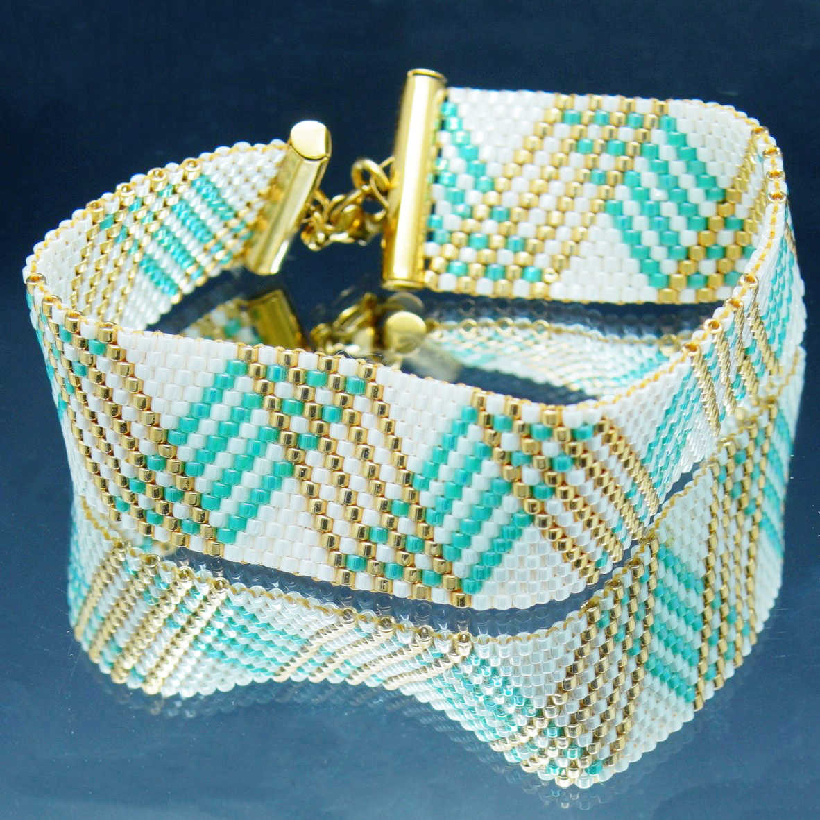 Composé de 14 rangs de perles Delica Miyuki, ce bracelet dévoile un motif à chevrons inspiré des tissus tissés, revisité dans une palette de couleurs élégantes : bleu roi éclatant, turquoise rafraîchissant, noir profond ou ivoire lumineux, relevés de touches dorées ou cuivrées.