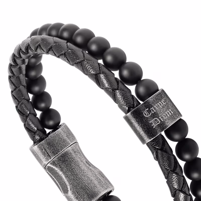 - Insert en Acier Noir Vieilli Gravé « Carpe Diem » : Au centre du bracelet, un insert en acier noir vieilli arbore l’inscription « carpe diem, » un rappel à saisir l’instant présent et à vivre pleinement chaque moment.
