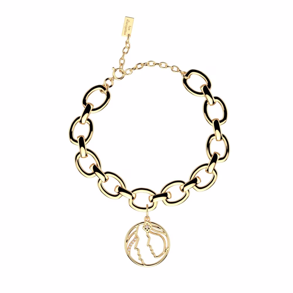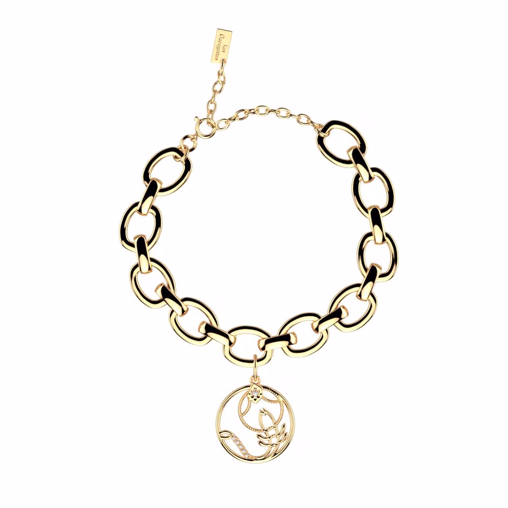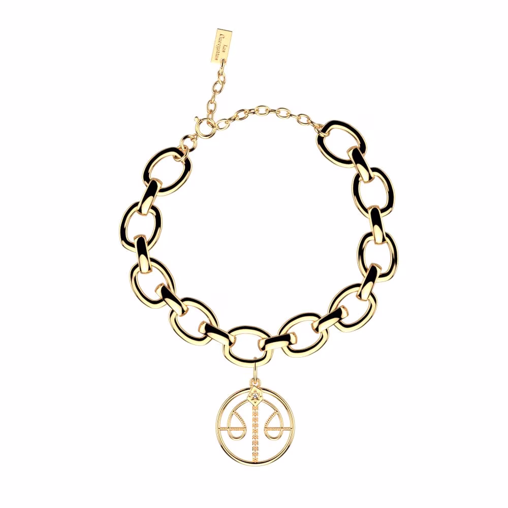 Déclinée en finition dorée lumineuse, cette ligne exclusive célèbre la force et la singularité de chaque signe du zodiaque, à travers des créations au design puissant et personnalisable. Chaque bracelet se distingue par une chaîne à maillons XXL au style affirmé, associée à une pampille ronde de 20 mm de diamètre, finement découpée selon la silhouette de votre signe astrologique. Ce motif ajouré est délicatement pavé d’oxydes scintillants, apportant éclat et élégance à l’ensemble.