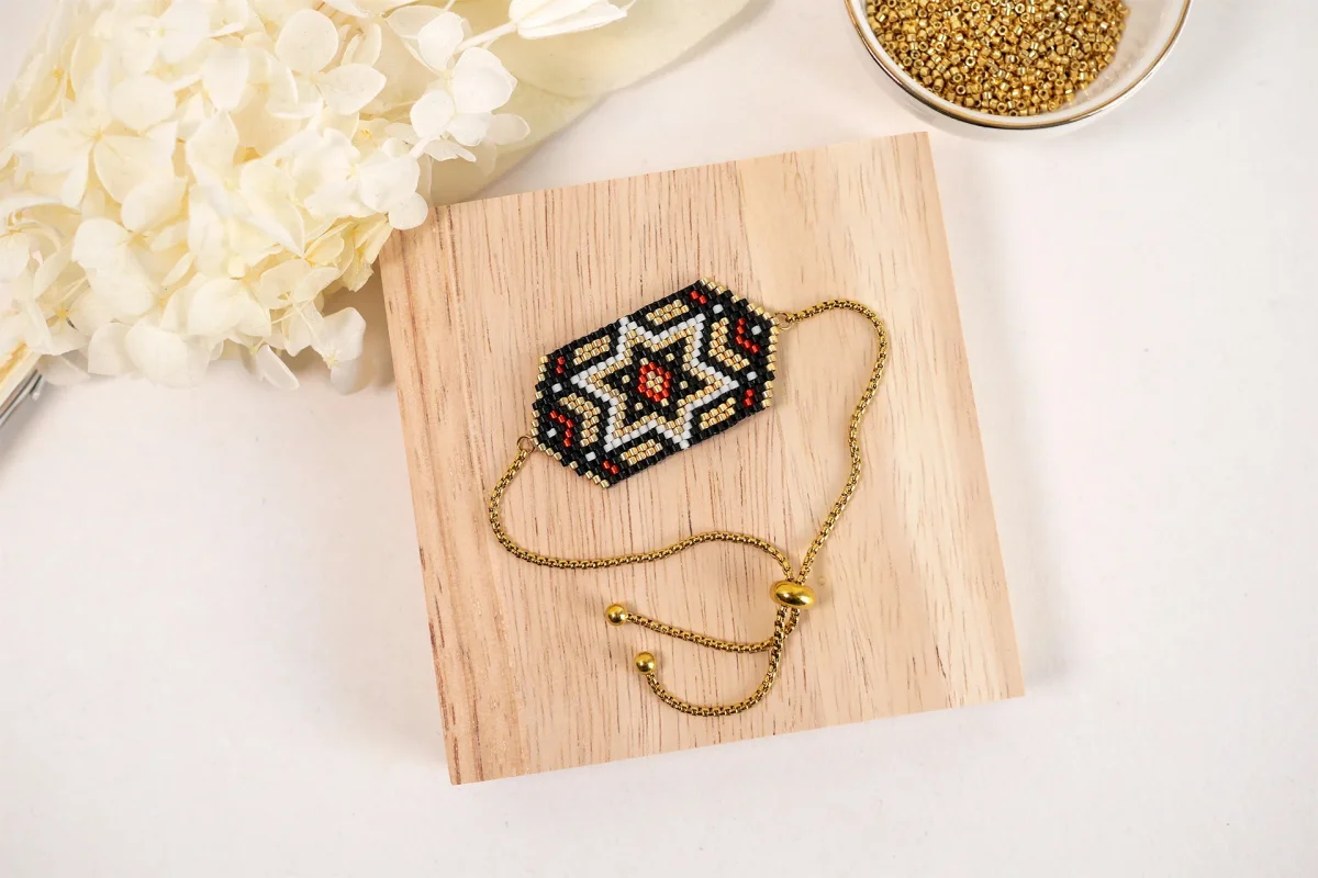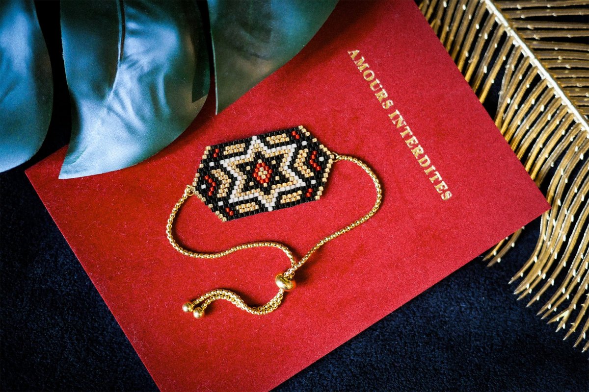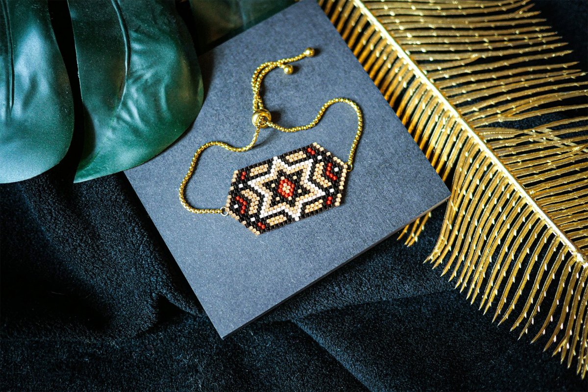 Technique du tissage façon Brickstitch, qui consiste à enfiler les perles une par une solidement.