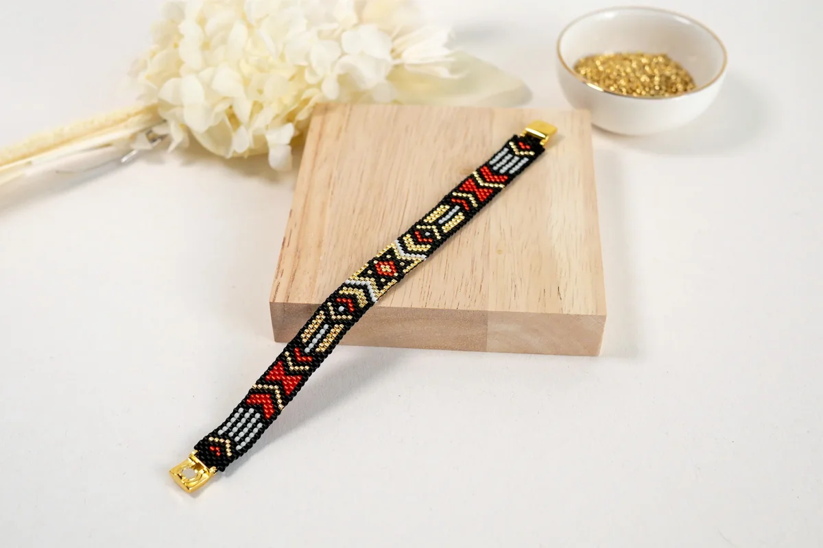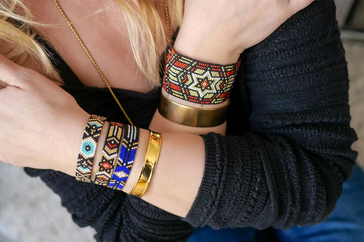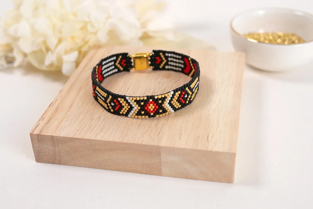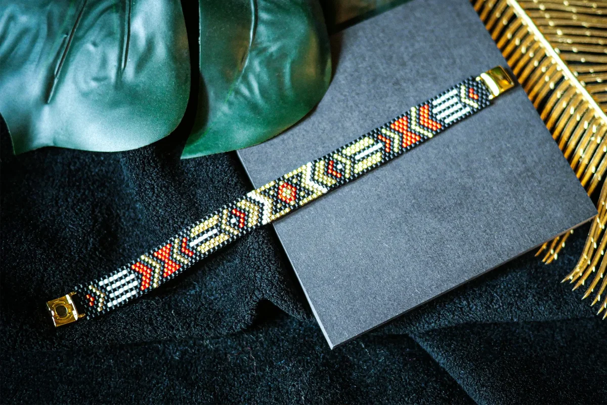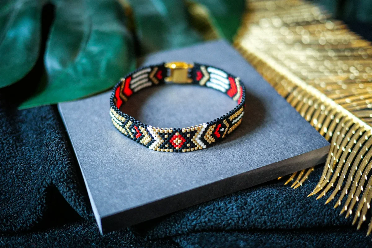 Technique du tissage façon Peyote, qui consiste à enfiler les perles une par une solidement. Cette technique complexe donne un rendu plus résistant, qualitatif et élégant.