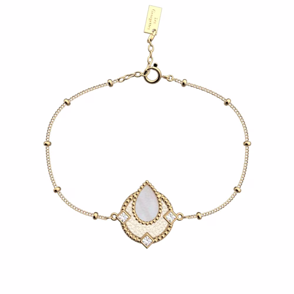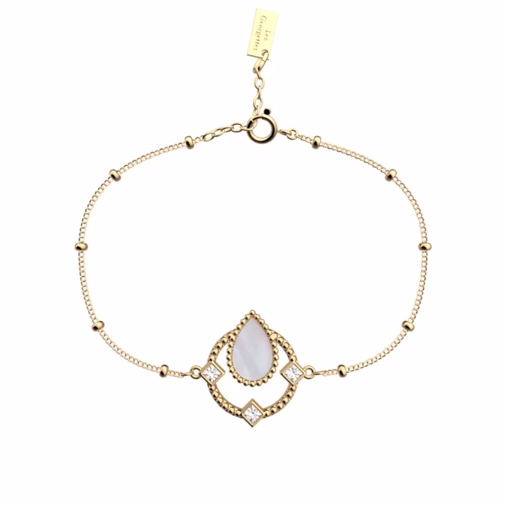 Laissez-vous séduire par l’élégance délicate du bracelet Constance signé Les Georgettes. Son motif ajouré de 16 mm, orné d’un éclatant cabochon en nacre et de quatre oxydes lumineux, apporte une touche de raffinement intemporel à votre poignet.