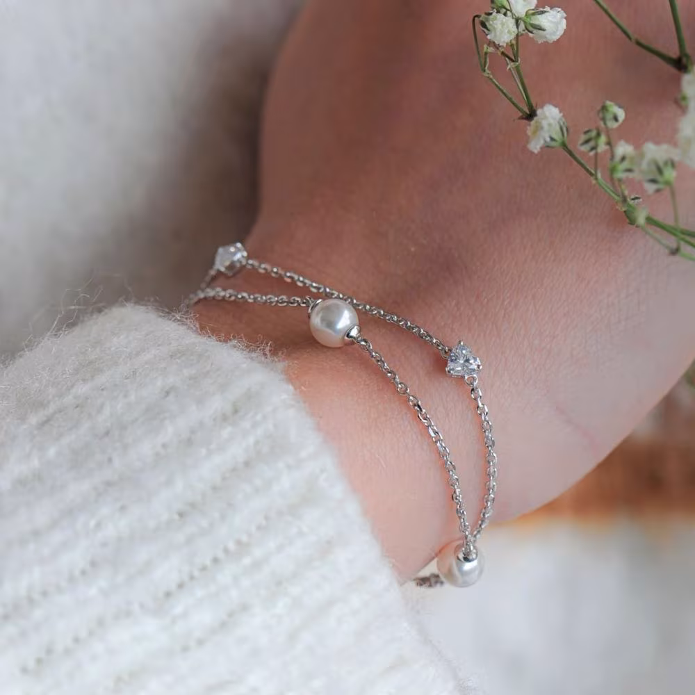 Ce bracelet se distingue par ses trois perles blanches subtilement mises en valeur par de petits oxydes de zirconium étincelants, qui captent la lumière à chaque mouvement. Deux chaînes fines à mailles rondes en argent viennent compléter cette création, apportant fluidité et légèreté au poignet.