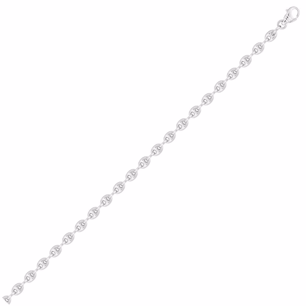 Ce bracelet en maille Grain de Café creuse est fabriqué en or blanc rhodié 18 carats, offrant une élégance moderne et intemporelle. Avec une largeur de 5 mm, il combine légèreté et raffinement pour un port confortable au quotidien. Son fermoir mousqueton assure une fermeture pratique et sécurisée.