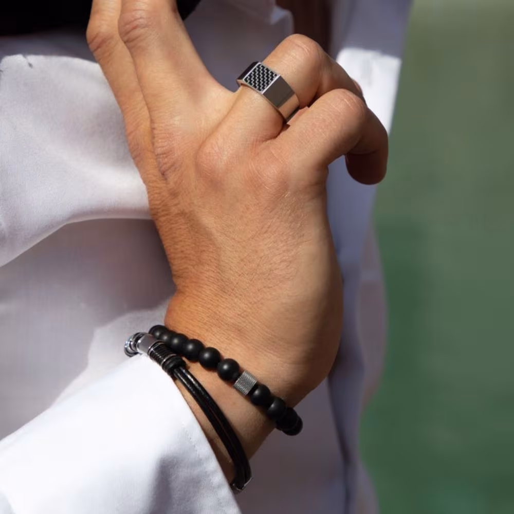 Un élément en acier argenté moleté vient sublimer l’ensemble, ajoutant une touche sophistiquée et moderne. Idéal pour un style à la fois sobre et raffiné, ce bracelet s’adapte parfaitement à toutes les occasions.[/vc_column_text][/vc_column][/vc_row]