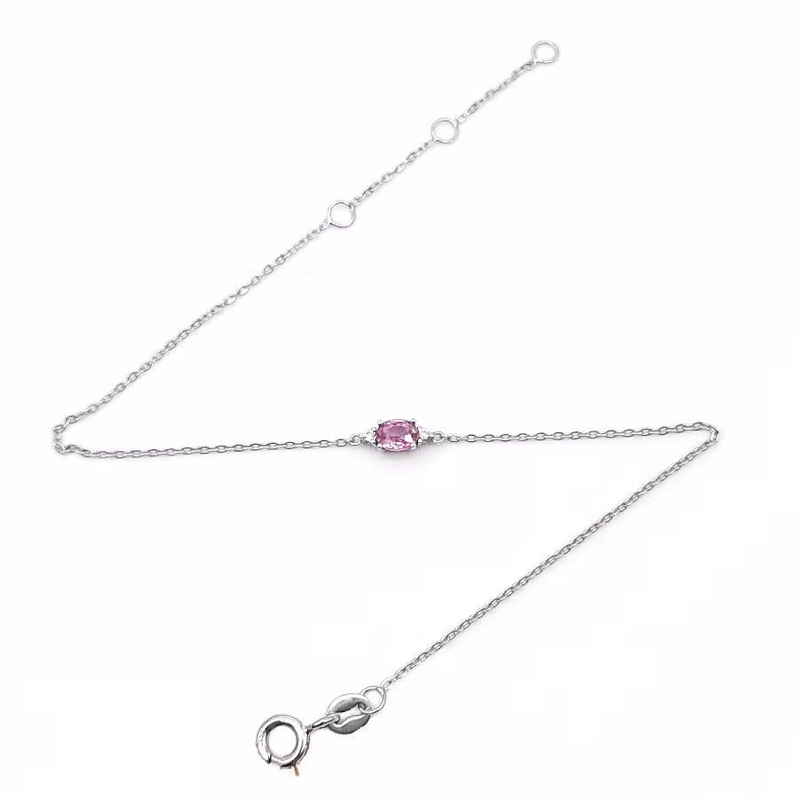 Ce bracelet en or blanc 18 carats présente un saphir rose de qualité joaillerie au centre, d’une impressionnante taille de 0,25 carat. De part et d’autre du saphir, deux petits diamants ajoutent une touche supplémentaire d’éclat. La chaîne en maille forçat, ajustable de 15 à 18 cm, souligne l’élégance intemporelle de cette pièce.
