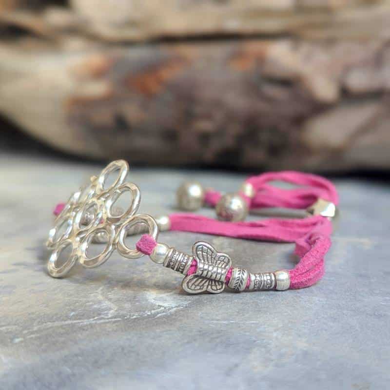 Le bracelet Karen en argent artisanal KWEÏ est une pièce unique. Un modèle au design chic et original. Ses cordons en cuir rose vif et ses apprêts en argent thaï en font un bijou merveilleusement décalé et exotique. Il est parfait pour toutes les tailles de poignet et peut se porter lâche ou serré. Cette création à été fait-main par un artisan des tribus Karen, au nord de la Thaïlande.