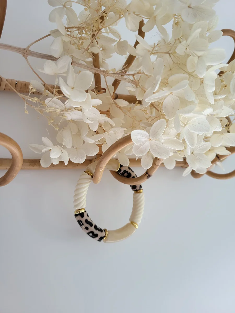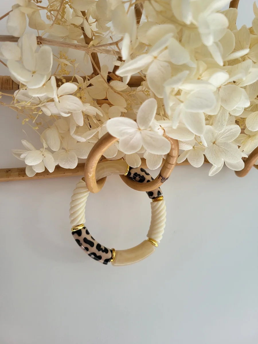 Bracelet léopard élastique fait main – Perles tubes résine incurvées – Bijou tendance imprimé animalier, tons naturels beige, noir et crème