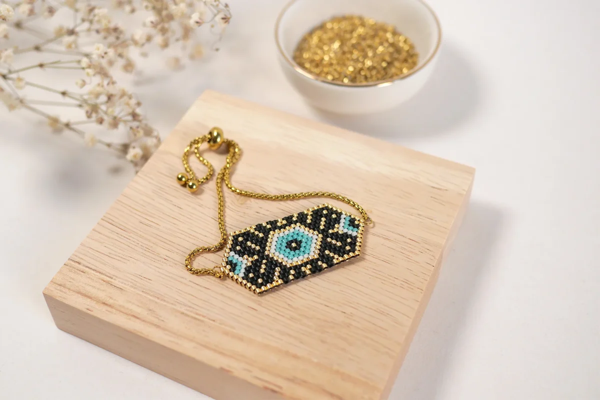 Technique du tissage façon Brickstitch, qui consiste à enfiler les perles une par une solidement. Cette technique complexe donne un rendu plus résistant, qualitatif et élégant.