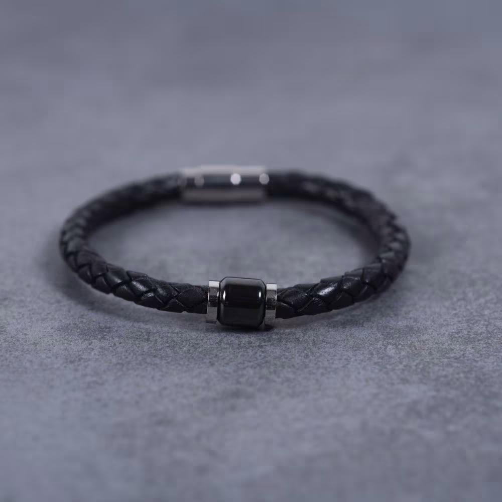 Le bijou pour homme Adham de Phebus offre une originalité distincte avec ses perles en acier 316L inoxydable d’un blanc brillant, formant un cercle autour d’un motif en céramique noire. Le bracelet souple en cuir noir ajoute une touche de caractère. Avec une longueur de 21 cm, il se ferme facilement grâce à un aimant, offrant à la fois praticité et style.